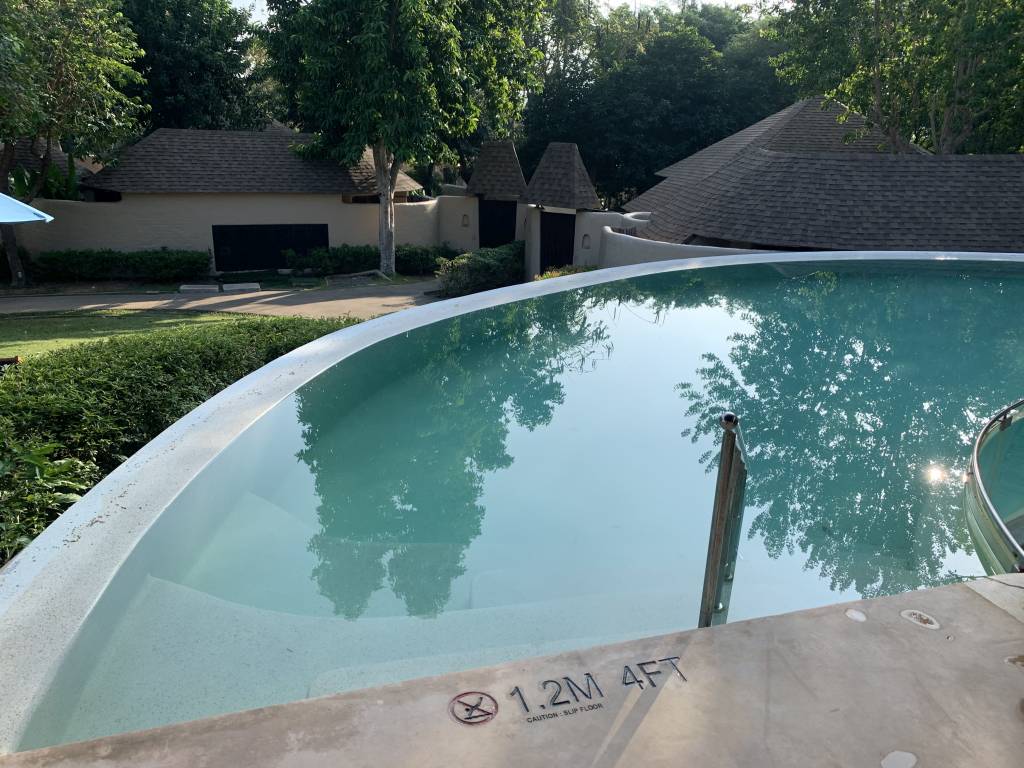 Nicht weniger Vielfältig ist der Außenbereich der Villa. Das zentrale Element ist natürlich der Pool mit 1,20 Meter Tiefe. Der Pool ist zwar kein Sport-Schwimmbecken aber mehr als die Planschbecken in vielen anderen Resorts.