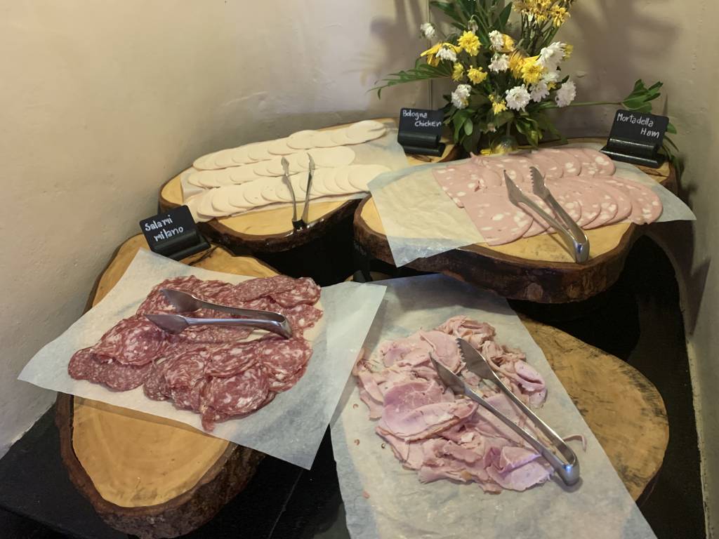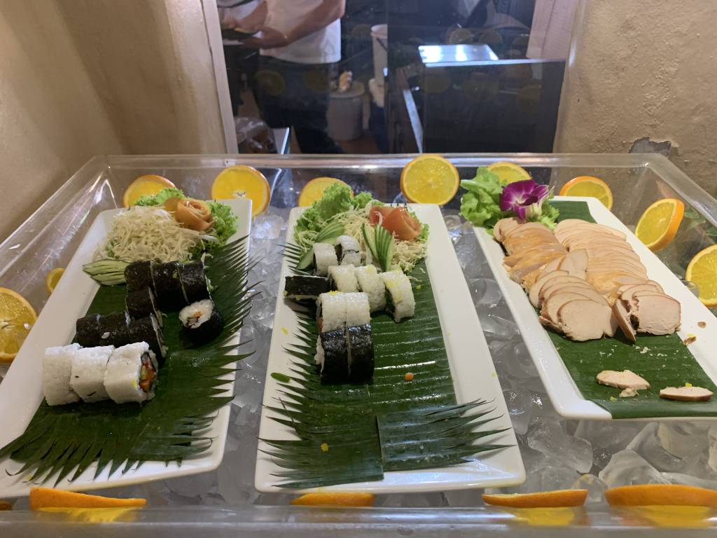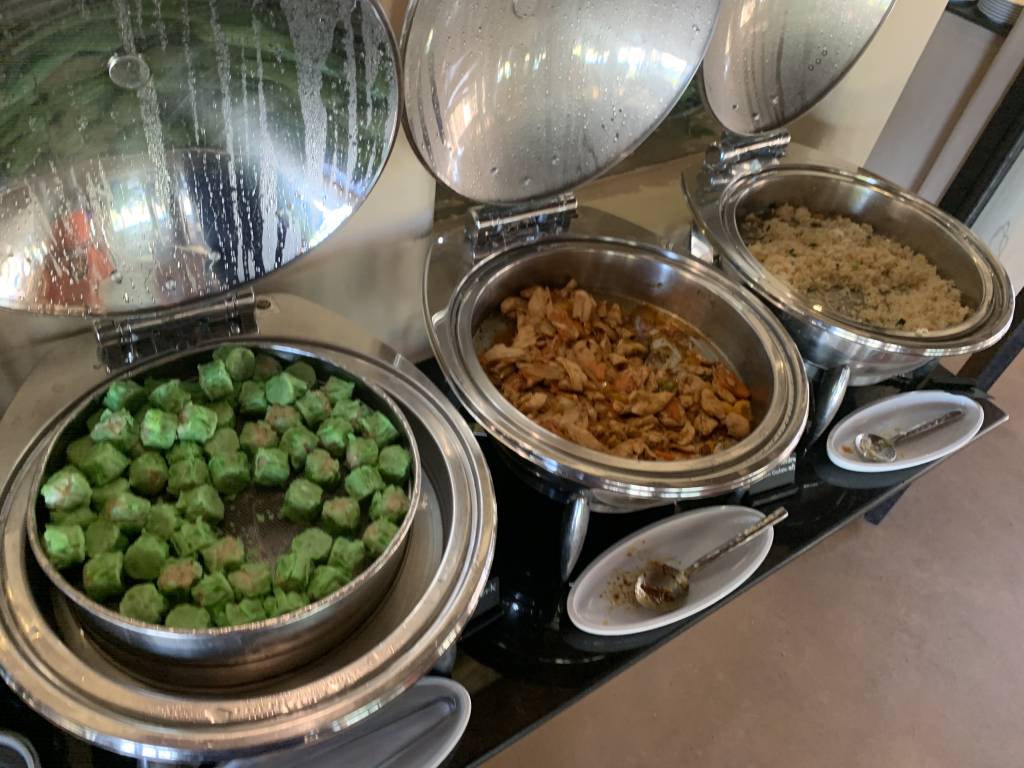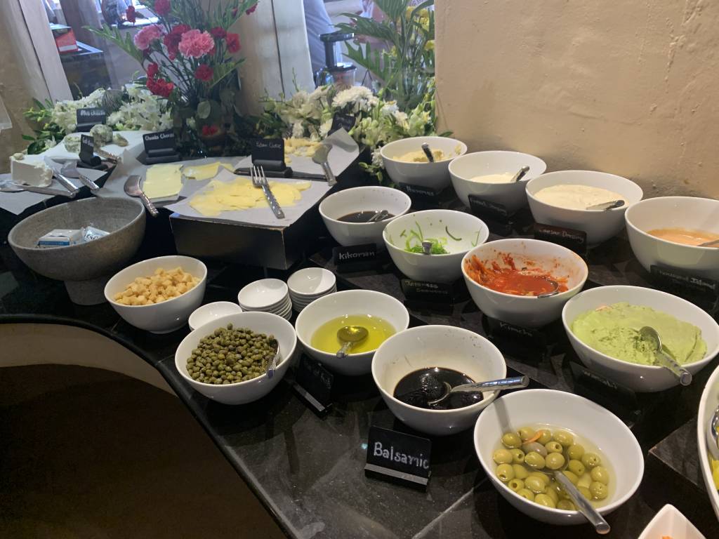 Die umfangreiche Auswahl an a la Carte Speisen wird durch ein noch umfangreicheres Büffet ergänzt. So gibt es eine Auswahl warmer asiatischer Gerichte, Brot, Gebäck und vieles Weiteres. In einem separaten gekühlten Raum gibt es eine hochwertige Auswahl an Wurst und Käse. Dazu Joghurt, Milch und Smoothies. Auch Salat und täglich wechselndes Sushi gehören zum Angebot.