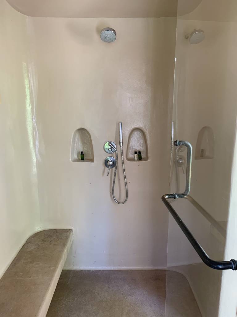 Wer Duschen oder Baden möchte, hat hierfür mehrere Optionen. Entweder man nutzt die Dusche im Inneren, die gleichzeitig auch als Dampfbad herhält. Oder man entscheidet sich durch eine Tür nach draußen zu wechseln und duscht im Freien oder nimmt ein Bad in der überdachten Außenbadewanne.