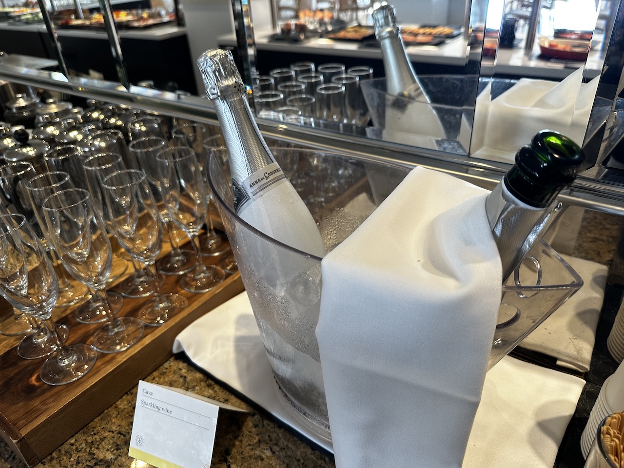 Einige Getränke und Säfte stehen auf dem Buffet, im Sortiment ist auch Cava.