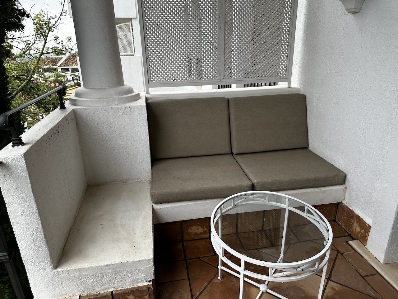 Neben den Sitzgelegenheiten im Zimmer gibt es noch welche auf der Terrasse, die aber eher ein Balkon ist. Hier sind die Abnutzungserscheinungen witterungsbedingt am Größten.