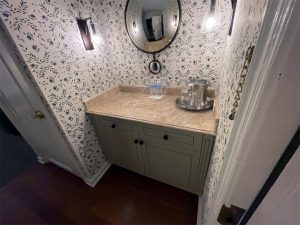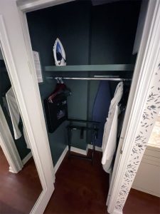 Der Vorsprung hinter der Bar ist ein als Wand getarnter Kleiderschrank. Er hat eine Drehtür, auf deren Innenseite sich ein fast bodentiefer Spiegel befindet. Zusammen mit dem Spiegel über der Bar kann man den Eingangsbereich des Zimmers gut nutzen, um sich für eine schicke Veranstaltung zurechtzumachen.