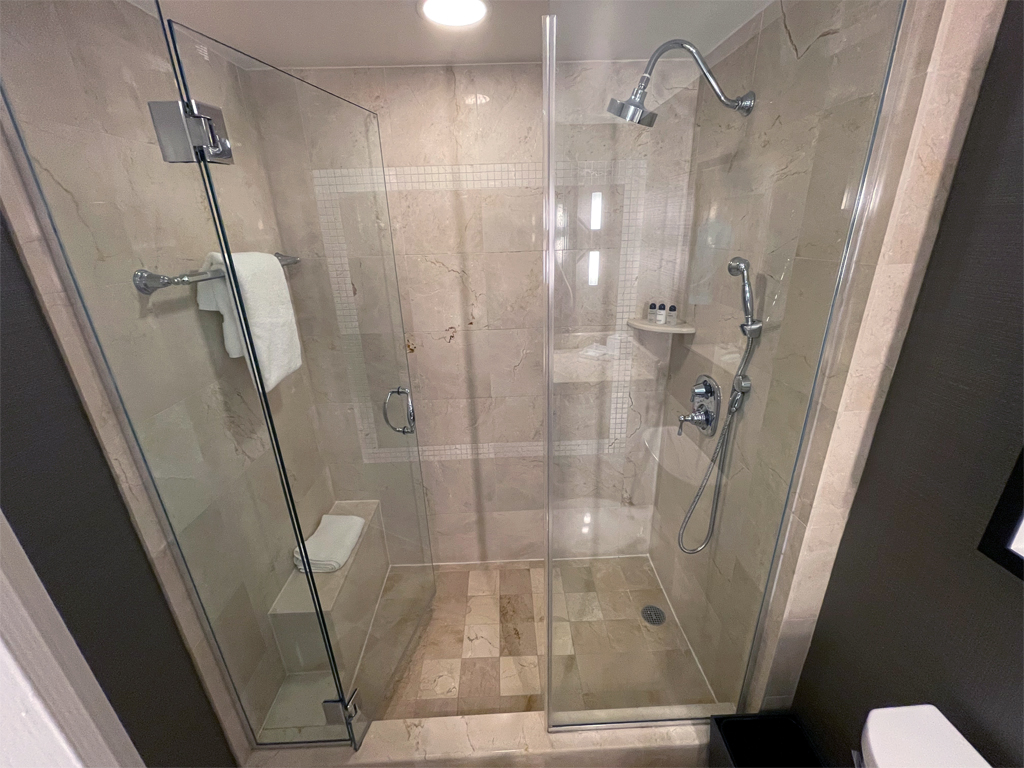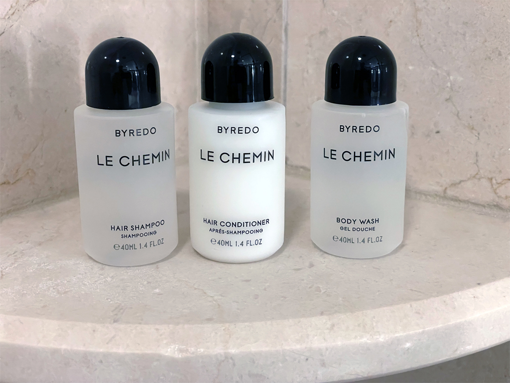 Im Flur erwartet die Gäste eine kleiner Barschrank. Allerdings gab es dort nur zwei halbe Liter Wasser, leere Gläser und einen leeren Eisbehälter. Gegenüber der Bar befindet sich das Badezimmer. Es ist angenehm groß, mit einem Waschtisch mit einem großen Waschbecken. Die ebenerdige Dusche ist ebenfalls groß ausgefallen und bietet sogar eine Sitzgelegenheit. Toilettenartikel von Byredo „Le Chemin“ stehen am Waschbecken und in der Dusche bereit. Der Rasierspiegel hängt gar nicht einmal so tief. Dafür gab es von mir gleich einen Pluspunkt.