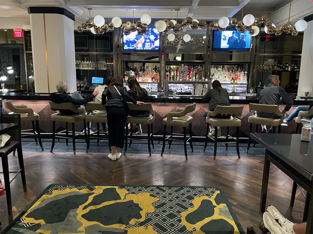 Die Bar selbst hat einen schwarzen Marmortresen mit Sitzplätzen davor. Das „Herzstück“ ist das große Alkoholregal. An den jeweiligen Enden oben befinden sich Fernseher, auf denen Sportevents übertragen werden.