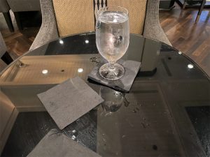 Zeitsprung. Ein anderer Kellner kam, stellte ungefragt ein Glas auf meinen Tisch. Doch bevor er das tat, versäumte er nicht, schwarze Servietten wie Konfetti auf dem Tisch zu verteilen. Das Befüllen mit eiskaltem Wasser erfolgte dann so schwungvoll, dass Servietten, Tisch und Gast nass wurden. Statt sich in Entschuldigungen zu ergehen, machte der Kellner nassforsch auf dem Absatz kehrt und verschwand.