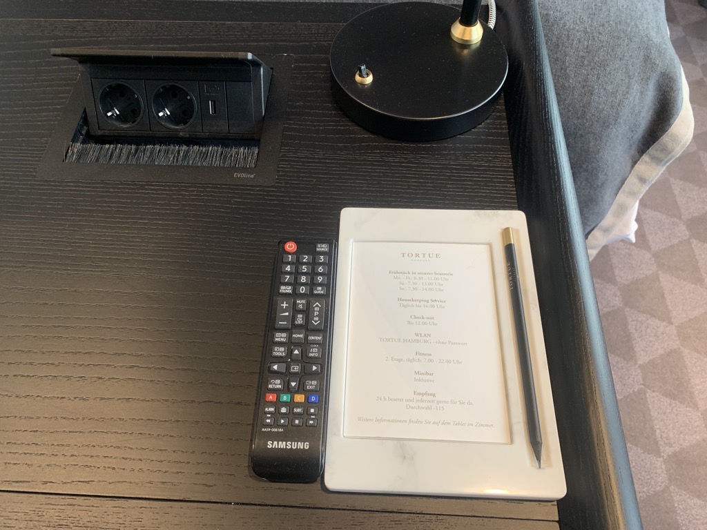 Neben dem Einbauschrank stand eine gemütliche Couch, darüber hing der großzügige Fernseher. Mittig im Zimmer, vor dem Fußende des Bettes, konnte man an einem Schreibtisch arbeiten. Auf dem Schreibtisch stand ein Tablet, in dem man allerlei Informationen über das Hotel und Hamburg finden konnte. In der Tischplatte waren USB-Anschlüsse und eine Steckdose verbaut, um seine elektronischen Geräte zu laden.