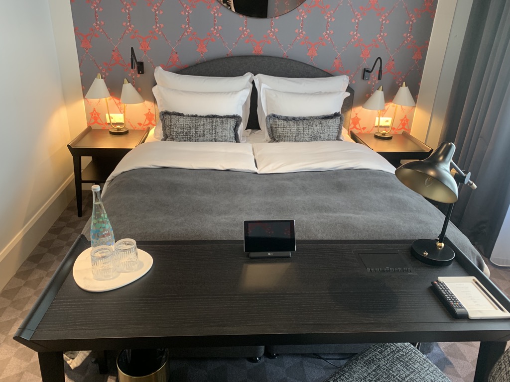 Zentrales Element des Zimmers war das Boxspringbett, welches mit mehreren Kissen und zwei einzelnen Decken ausgestattet war. Ich habe hier ausgezeichnet geschlafen und würde sogar sagen, dass ich selten in einem Hotel in einem so gemütlichen Bett geschlafen habe. Rechts und links standen Nachttische, auch hier waren Steckdosen verbaut.