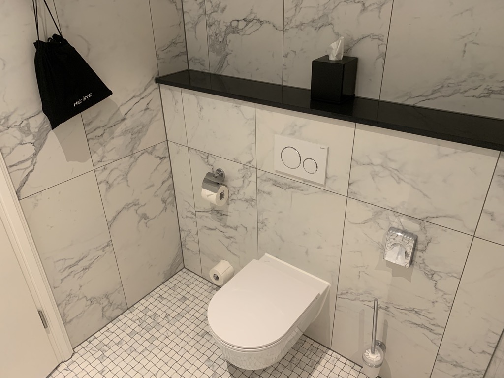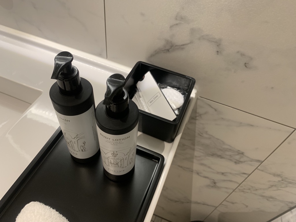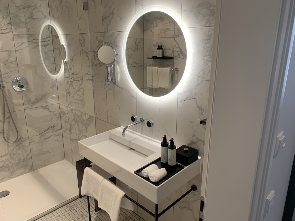 Mein Zimmer lag im zweiten Stock. Direkt nach dem Eingang auf der linken Seite befand sich das Badezimmer, welches mit einer großzügigen Walk-In Dusche, einem Waschbecken und einer Toilette ausgestattet war. Am Waschbecken stand eine vollständige Auswahl an Amenities bereit, zudem verfügte es über ausreichend Ablagefläche.