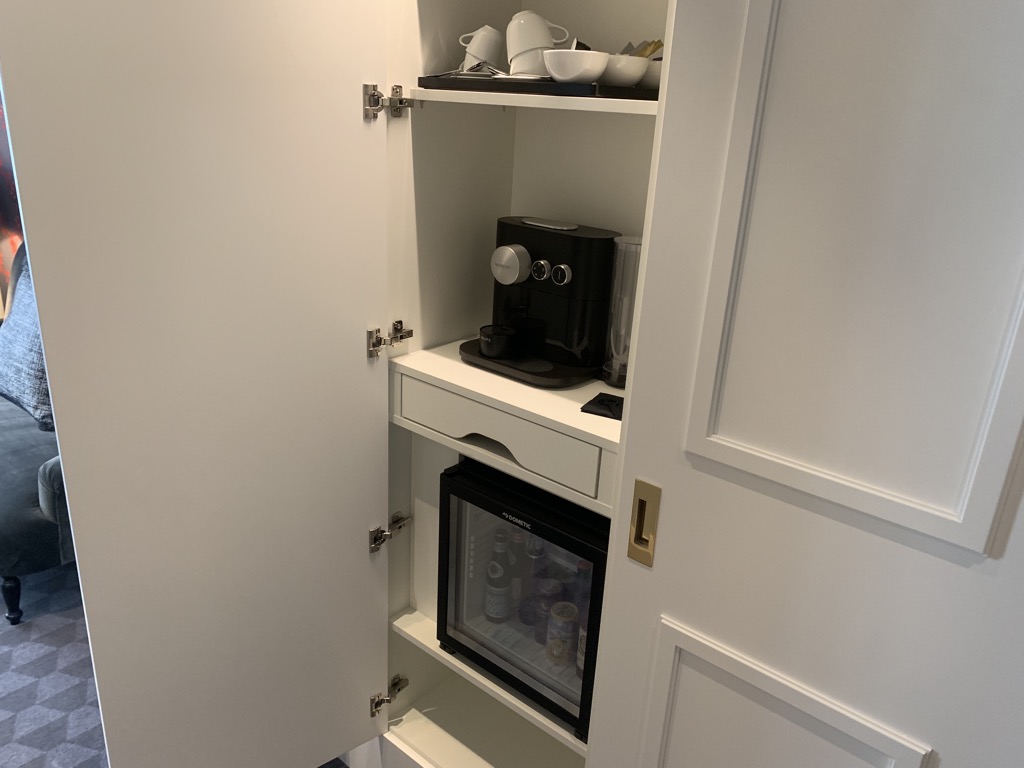 Gegenüber des Badezimmers war ein großer Schrank verbaut, in dem unter anderem auch die Kaffee- und Teestation, sowie die Minibar integriert war. Besonders hervorzuheben ist hier das All-Inclusive Konzept des Hotels. So konnte man alle Getränke aus der Minibar kostenfrei konsumieren und sie wurde zudem jeden Tag neu bestückt.