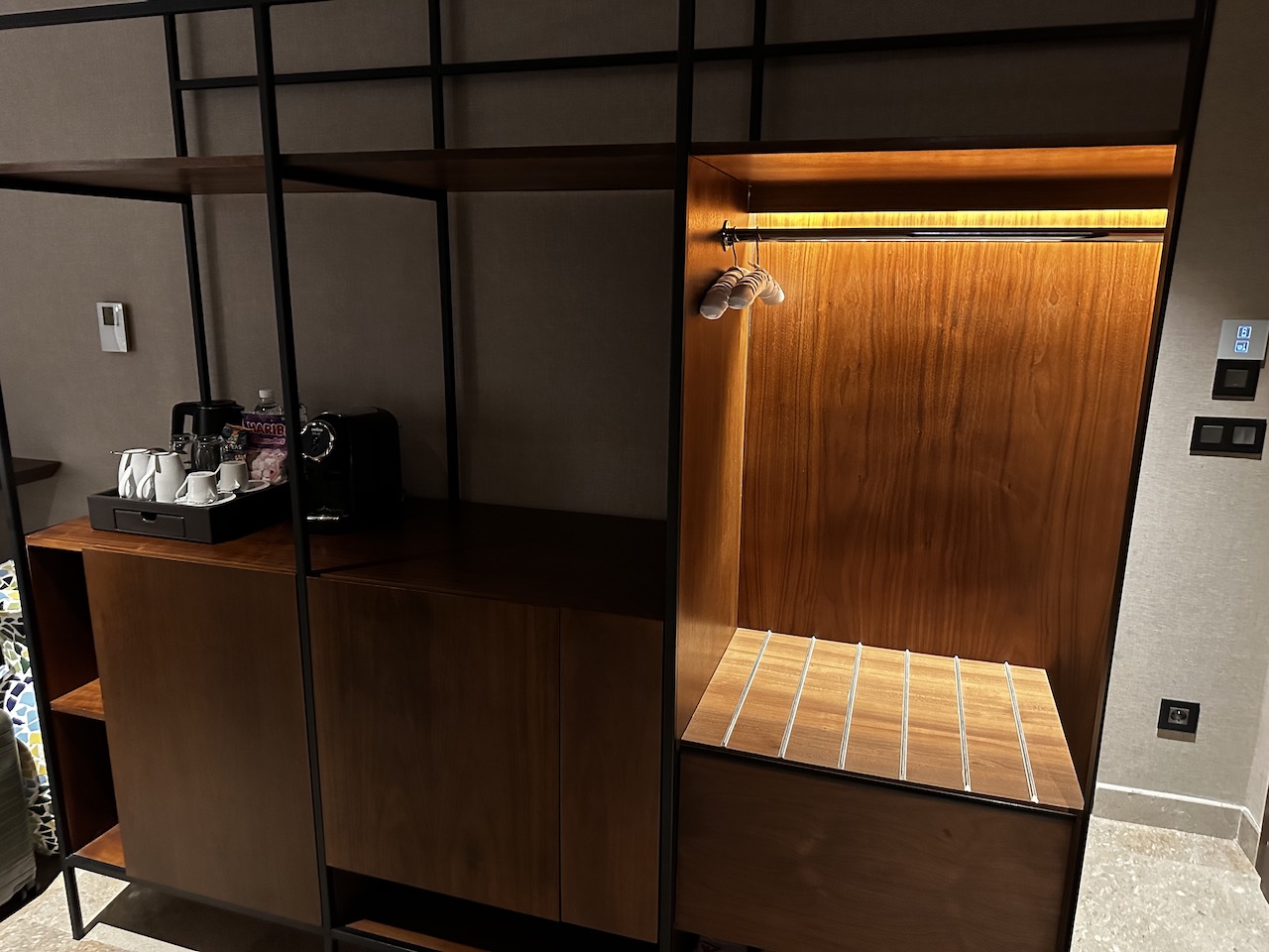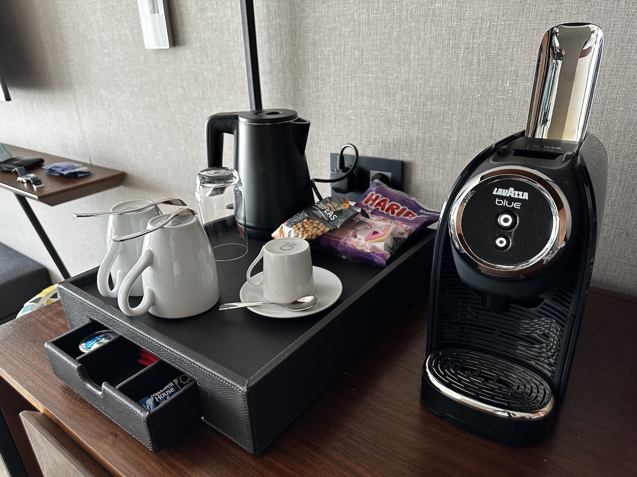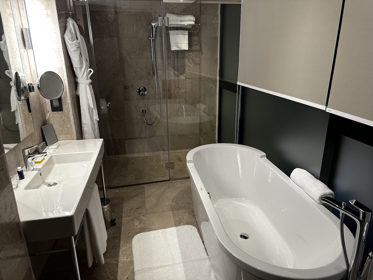 Weitere Annehmlichkeiten waren eine Espressomaschine, Wasserkocher, Safe, Minibar, Bademäntel…