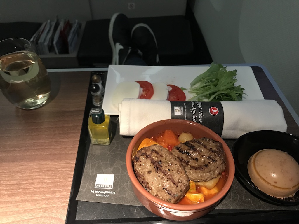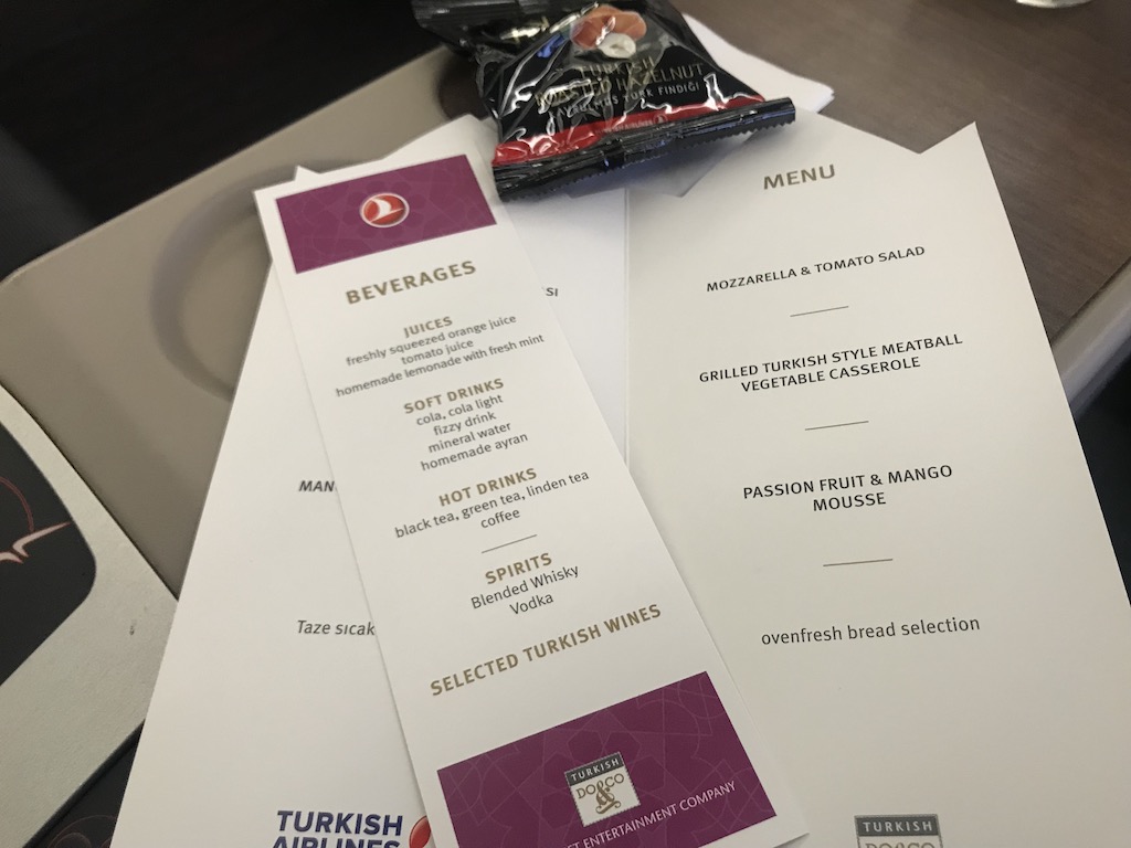 Auf meinem Inlandsflug, der rund eine Stunde dauerte, gab es kein heißes Tuch und auch nur ein Gericht zur Auswahl, was aber auf einem Kurzstreckenflug auch nicht verwunderlich ist. Dennoch wurde hierfür eine Speisekarte ausgeteilt, dazu zur Begrüßung auch noch einmal eine Tüte Nüsse. Das Gericht selbst waren auf meinem Flug türkische Mettbällchen mit Gemüse – dazu etwas Tomaten mit Mozzarella. Mir hat das Gericht sehr gut geschmeckt.