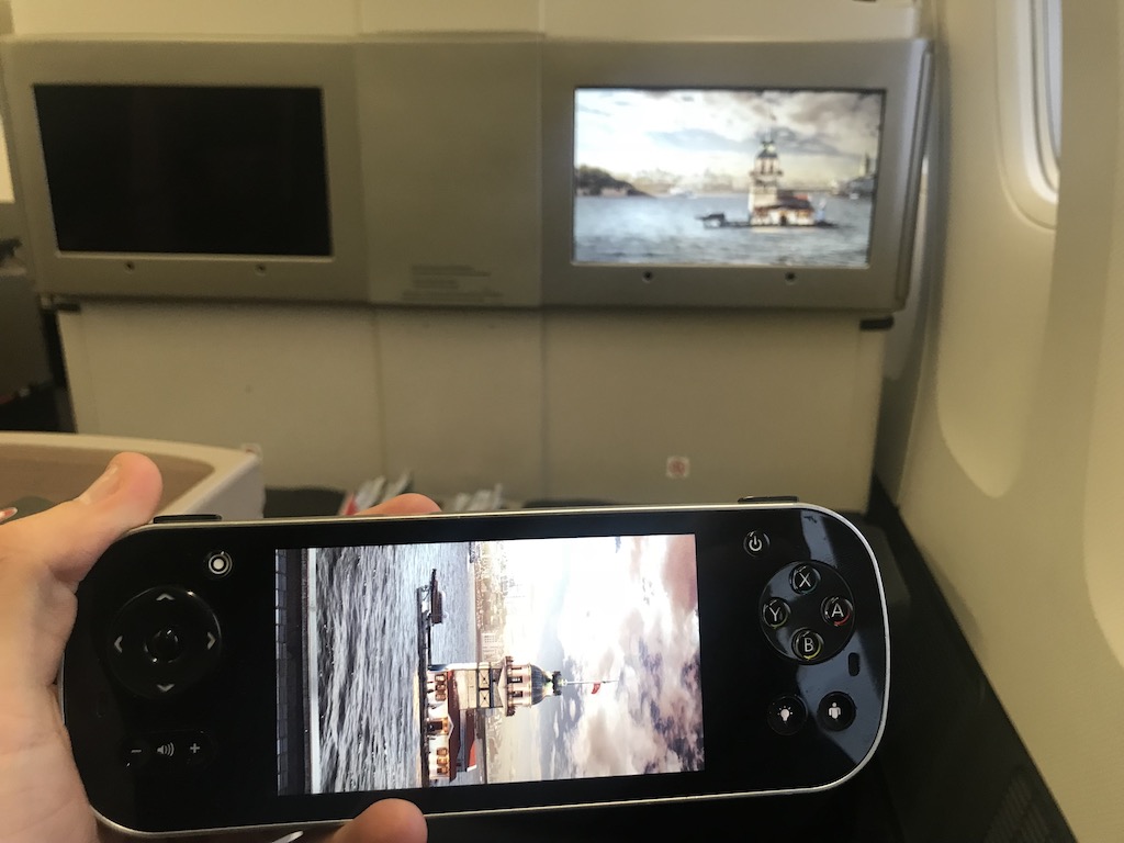 Das Inflight-Entertainment-System, das bei Turkish Airlines sehr üppig ausgestattet ist und auch viele deutsche Filme bietet, lässt sich bequem vom Sitz mit einer ausziehbaren Handfernbedienung steuern. Auf dieser findet sich ein Abbild des großen Bildschirms noch einmal in kleinerer Form. Der Tisch ist natürlich flexibel einstellbar, sodass auch das Essen in einer angewinkelten Sitzposition möglich wäre.