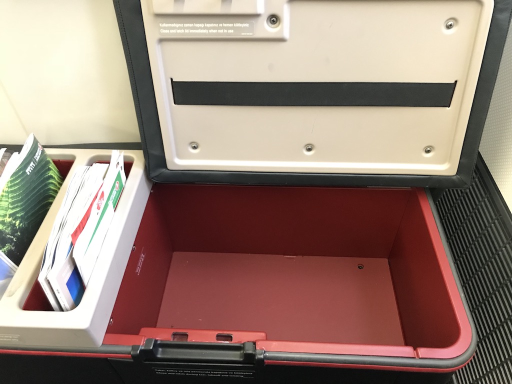 Direkt unter dem Bildschirm für das Inflight-Entertainment-System findet sich der großräumige Fußbereich, in dem sich auch ein großes Ablagefach befindet. Meine Weekendertasche konnte ich hier wunderbar verstauen.