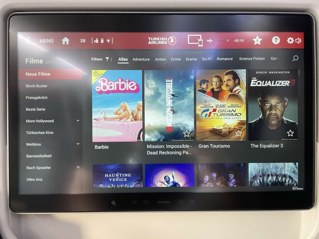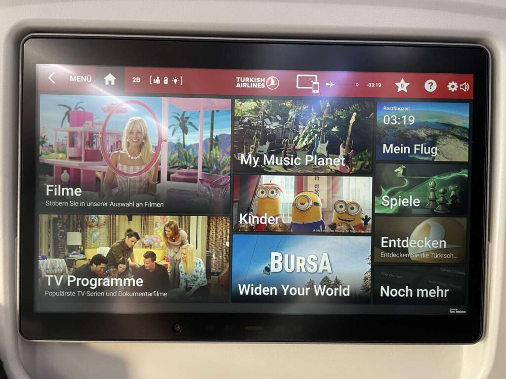 Auch auf der Turkish Airlines Kurzstrecke findet Ihr ein volles Inflight-Entertainment-System in allen Reiseklassen. In der Business Class befindet sich der Bildschirm im Sitz des Vordermanns (in der ersten Reihe an der Wand), der per Fernbedienung vom eigenen Sitz oder auch per touch bedient werden kann. Das Inflight-Entertainment System enthält zahlreiche Filme in unterschiedlichsten Sprachen, Musik, einen Inflight-Map und auch Videospiele.