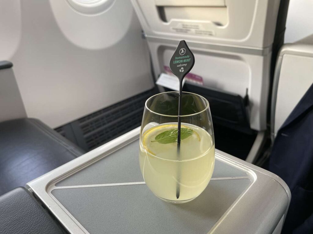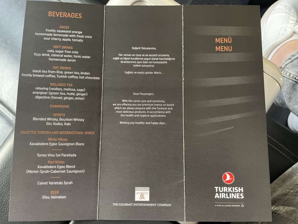 Die Rückseite des Menüs zählte die alkoholischen und alkoholfreien Getränkeoptionen auf. Neben einer überdurchschnittlichen Auswahl an Säften und Softdrinks, legt Turkish Airlines natürlich viel Wert auf das Angebot an heißen Getränken inklusive türkischem Kaffee und einer Auswahl an Wellness Teas. Noch mehr Lokalkolorit kam durch den hausgemachten Ayran auf.