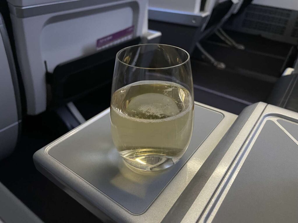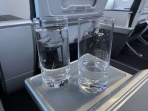 Nachdem alle Passagiere an Bord gegangen waren und auch im vorderen Teil der Kabine wieder etwas Ruhe eingekehrt war, begann die Kabinenbesatzung schon mit dem Service. Auf einem Tablett wurde mir zunächst eine Auswahl an Säften und Wasser als Welcome Drink angeboten. Champagner oder anderen Alkohol gab es in dem Fall nicht, was mich aber persönlich nicht störte. Danach wurden mir und den anderen Business Class Passagiren noch die Speisekarte für diesen Flug sowie Noise-Cancelling-Kopfhörer ausgehändigt. Auch zusätzliche Kissen hätte es auf Wunsch gegeben. Ein Amenity-Kit war für diesen kurzen Flug jedoch nicht vorbestimmt.