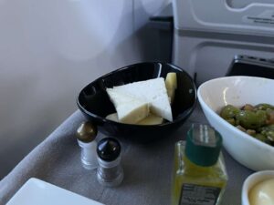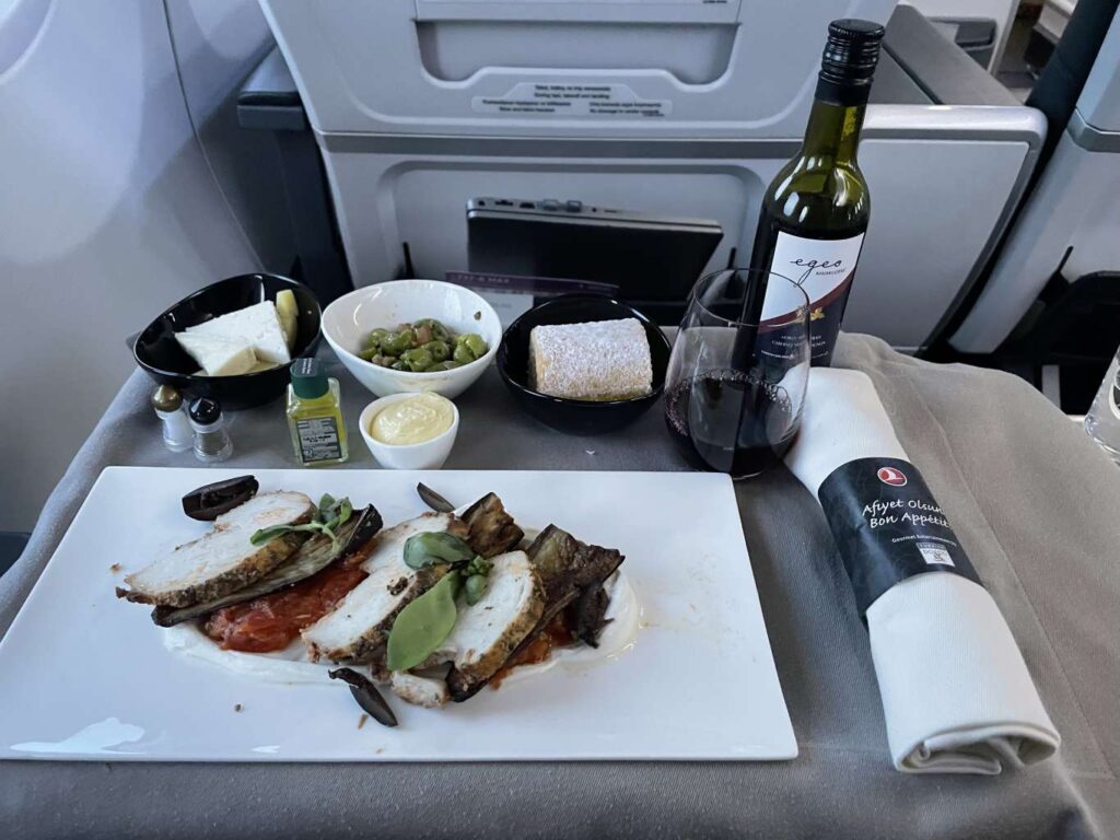 Auf meinem Flug TK1314 von Valencia nach Istanbul sollte es Hähnchen auf gebratenen Zucchini und Tomaten-Salat mit einer Joghurt-Soße geben. Als zweite Vorspeise wurden Oliven mit Granatapfel serviert. Bei den Hauptgerichten konnte ich aus geschmortem Rinderbäckchen, Seebrasse oder Pasta wählen. Als Dessert gab es eine Auswahl an Käse und ein Erdbeer-Creme-Röllchen.