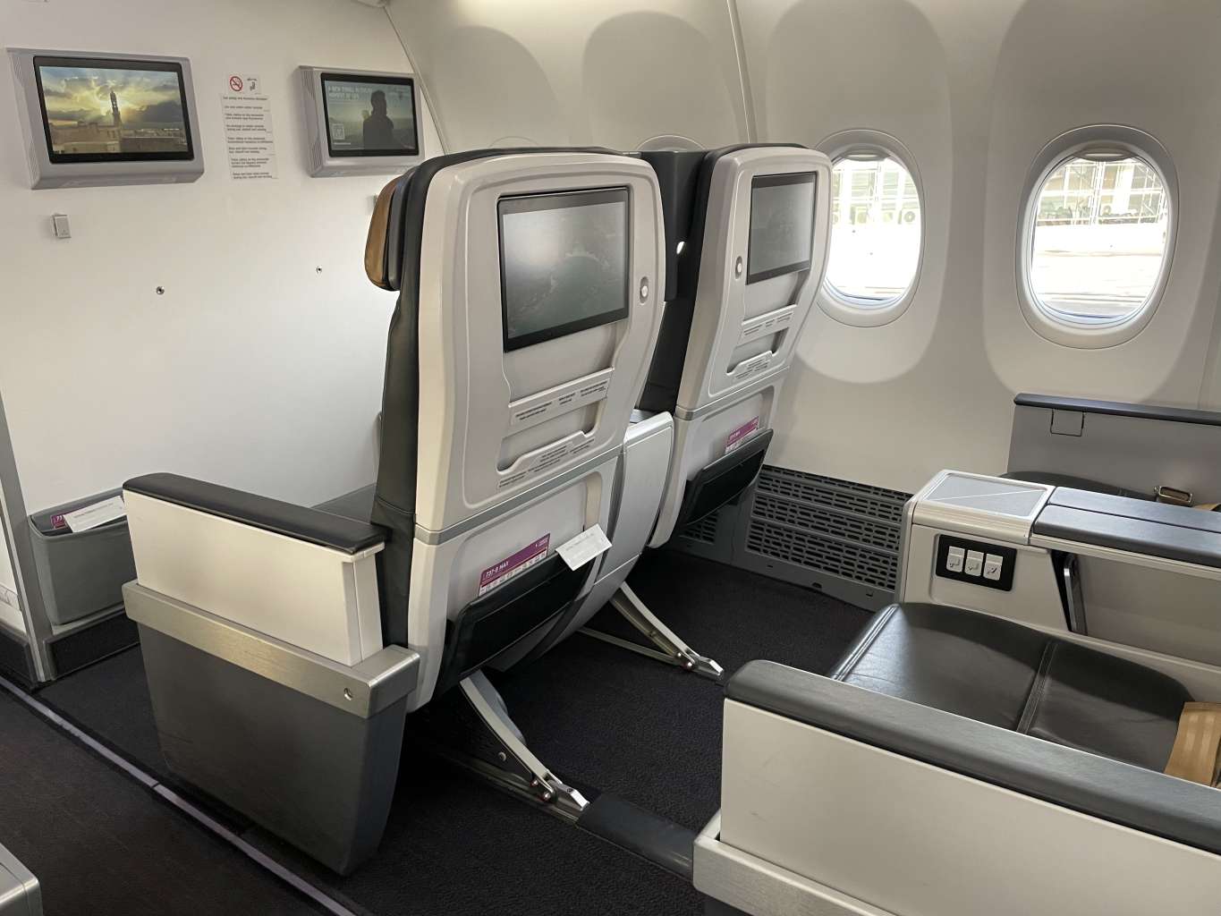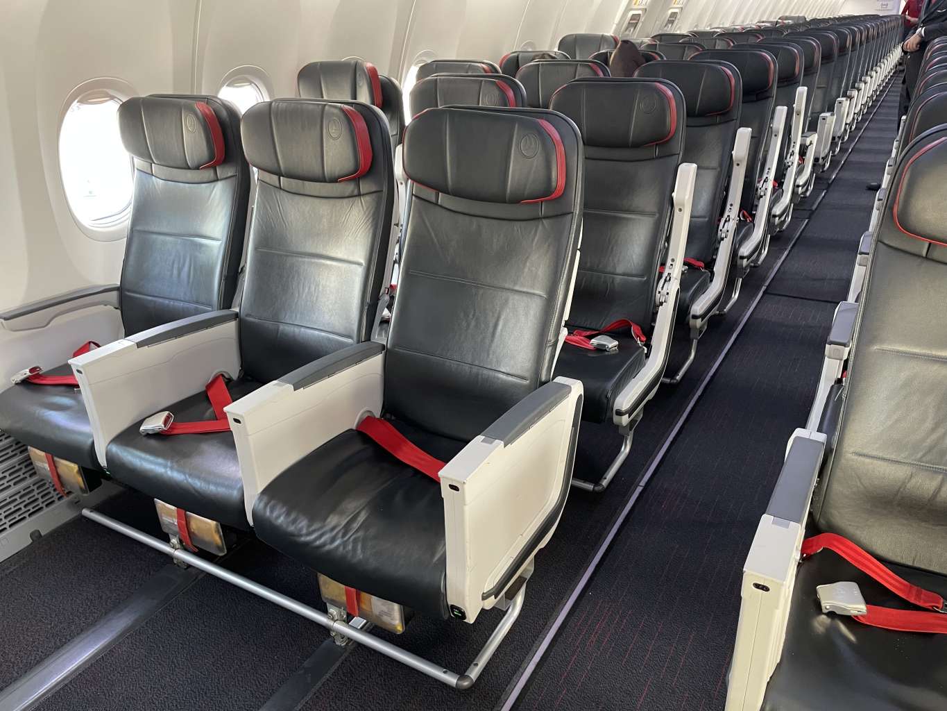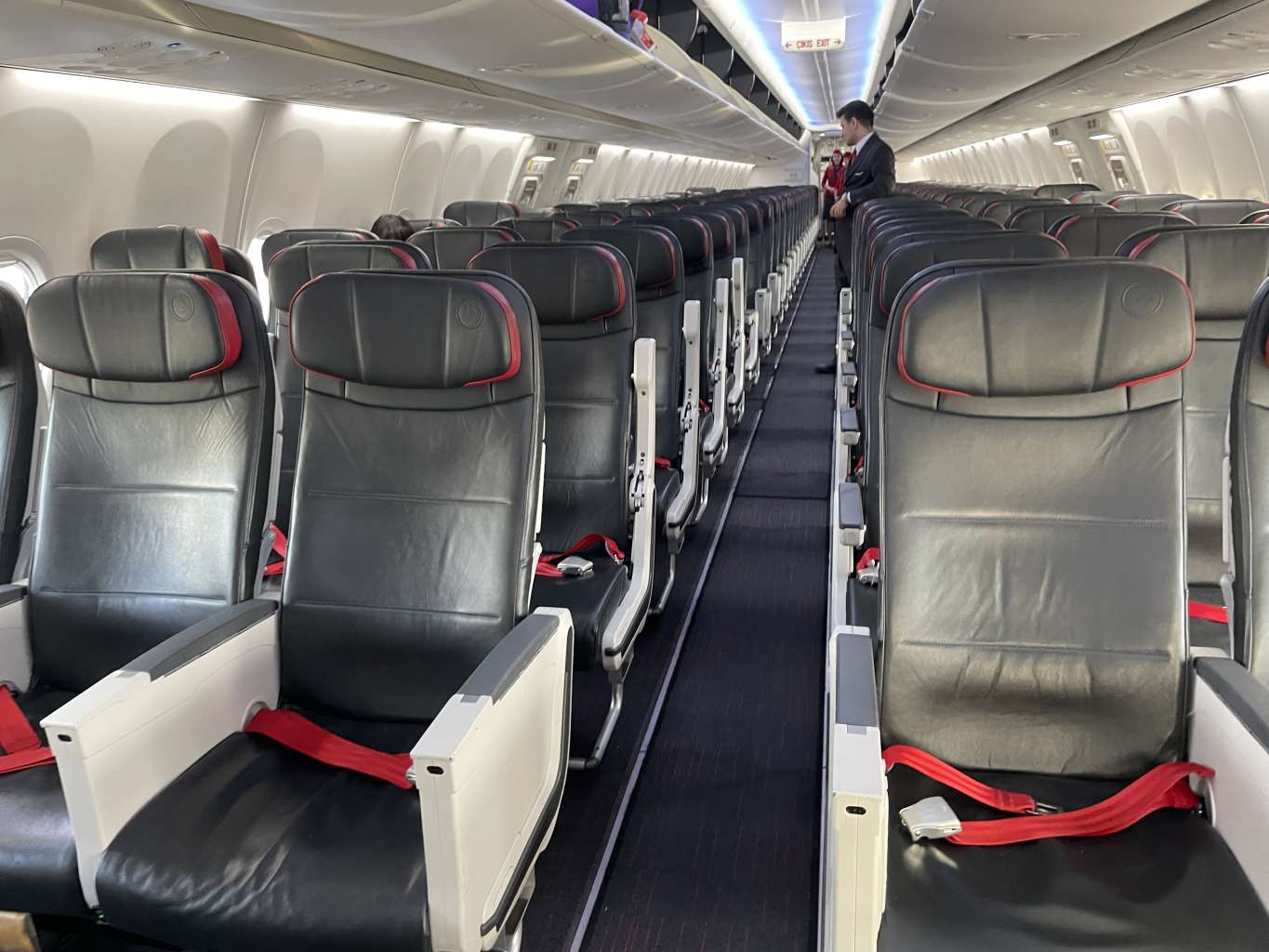 Ich stand zum richtigen Zeitpunkt am richtigen Ort und durfte damit als einer der Ersten die Boeing 737 MAX 8 betreten. Die Crew grüßte frundlich und ich machte es mir zunächst auf Sitz 2B bequem, wechselte dann aber auf 2A ans Fenster, nachdem Reihen 1 und 2 komplett leer blieben. Natürlich außer mir.
