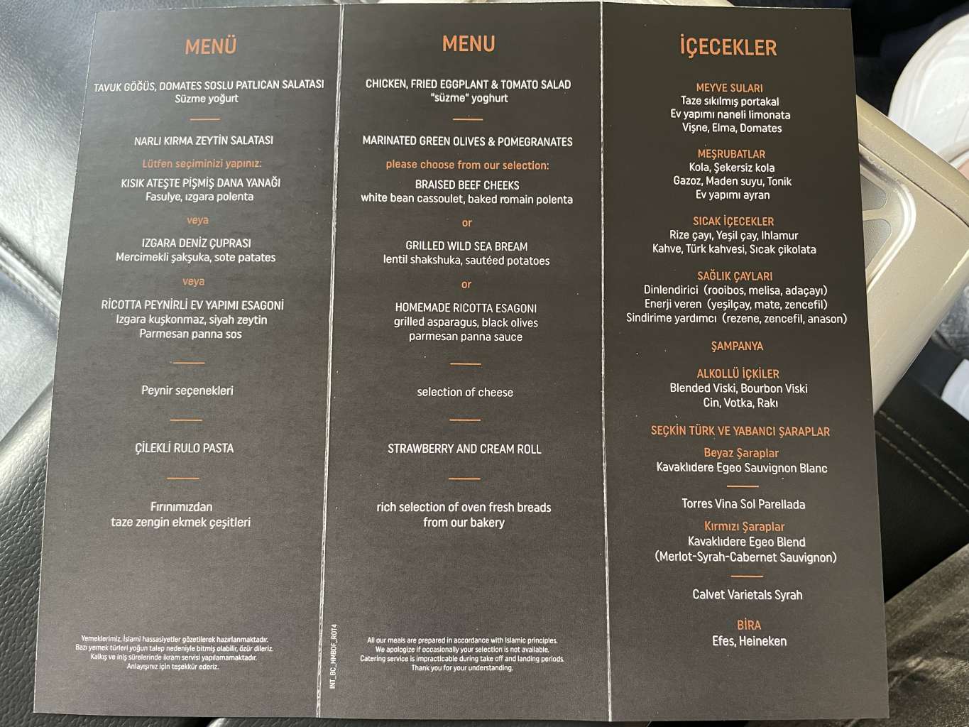 Die Rückseite des Menüs zählte die alkoholischen und alkoholfreien Getränkeoptionen auf. Neben einer überdurchschnittlichen Auswahl an Säften und Softdrinks, legt Turkish Airlines natürlich viel Wert auf das Angebot an heißen Getränken inklusive türkischem Kaffee und einer Auswahl an Wellness Teas. Noch mehr Lokalkolorit kam durch den hausgemachten Ayran auf.