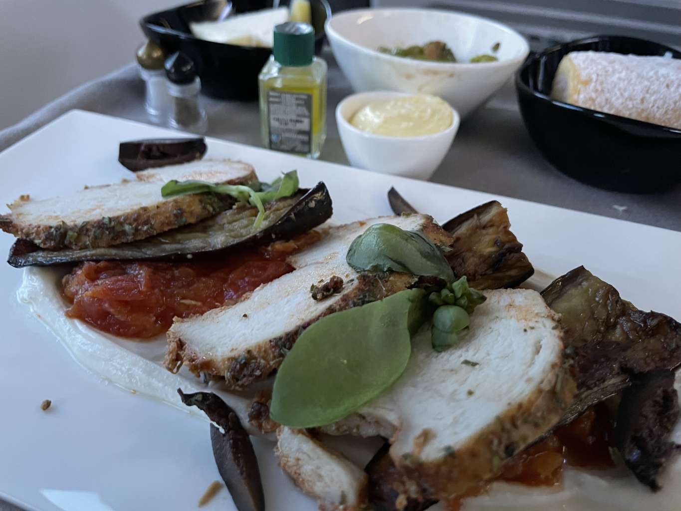 Nur etwas später wurde dann auch das Abendessen ausgeteilt. Dabei befanden sich alle Gänge mit Ausnahme der Hauptspeise auf einem Tablet. Im Anschluss ging noch eine Flugbegleiterin durch die Kabine und bot noch eine Auswahl an Brötchen an. Nachdem die Fluggäste ausreichend Zeit hatten, die Vorspeisen zu genießen, wurde ein Wagen mit der Auswahl an Hauptgerichten durch die Kabine gefahren. Dabei war von jeder Option immer ein Gericht bereits von der Alufolie befreit, so dass wir vorab sehen konnten, was wir uns aussuchen.