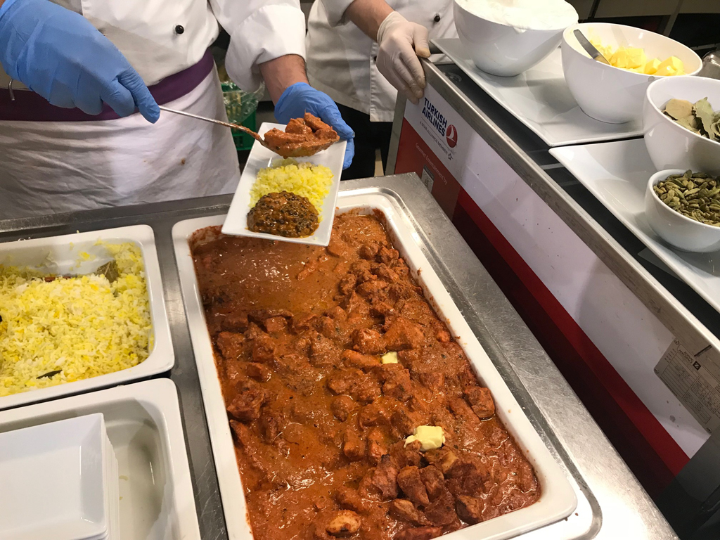An einer Catering-Station wird immer eine regionale Mahlzeit aus einem Land, das die mehrfach ausgezeichnete Airline anfliegt, angeboten. Während meines Besuches war dies Indien und es wurde ein sehr leckeres ‚Chicken Tikka Masala’ serviert.