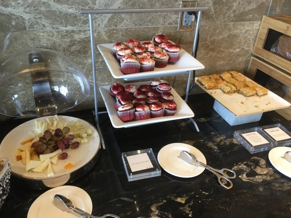 Bei den Desserts und Kuchen merkt man, dass man in den USA und nicht in der Türkei ist. Diese sind schon sehr auf den US Geschmack ausgelegt. Auch der Kaffee aus dem Automaten kann nicht mit der Barista in Istanbul mithalten. Für eine Business Class Lounge in den USA ist dies aber alles sehr gut!