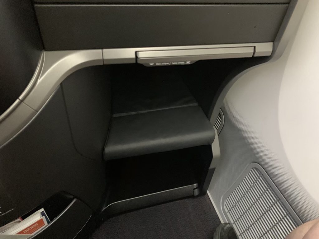 Sehr positiv fand ich wie aufgeräumt der Sitz wirkte, denn man hatte neben sich eigentlich nur die große Ablage. Ein kleines Staufach, welches man mit einer Schiebetür verschließen konnte, gab es auch. In diesem Staufach befand sich auch der Stromanschluss, ein USB Anschluss und die Kopfhörer.