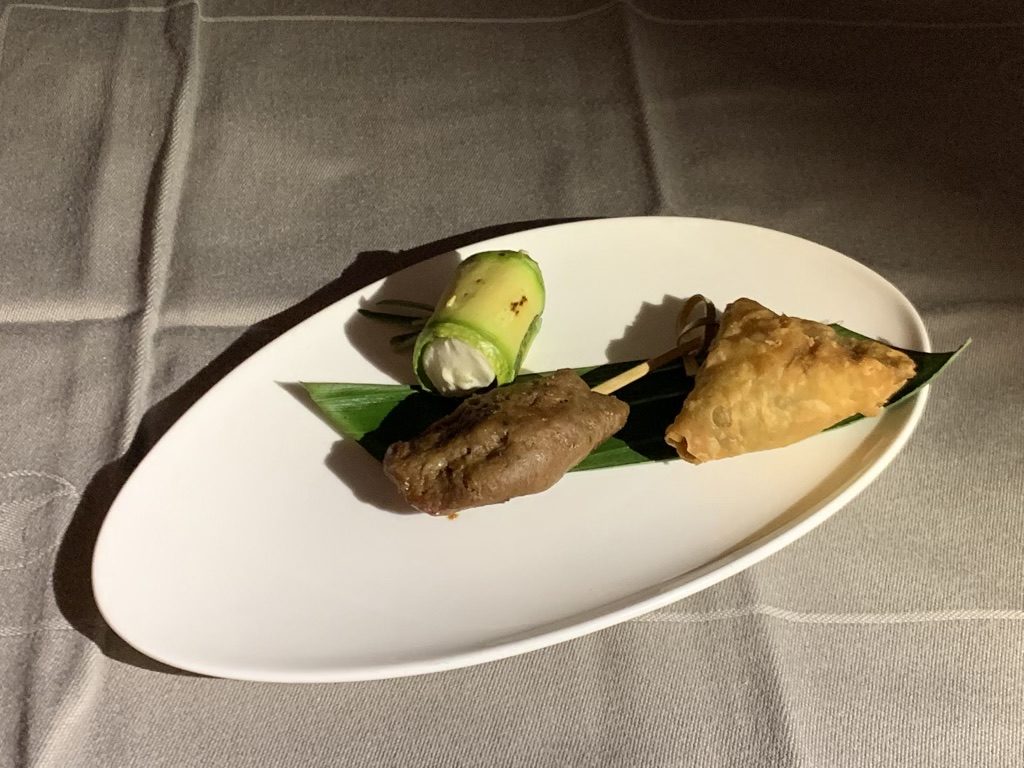 Der zweite Service war dann auch wesentlich schneller und man hat etwa drei Stunden vor Bali damit begonnen die Tische einzudecken. Die Vorspeise, welche direkt zusammen mit dem kleinen Dessert serviert wurde, war nicht sonderlich spektakulär, aber durchaus essbar.