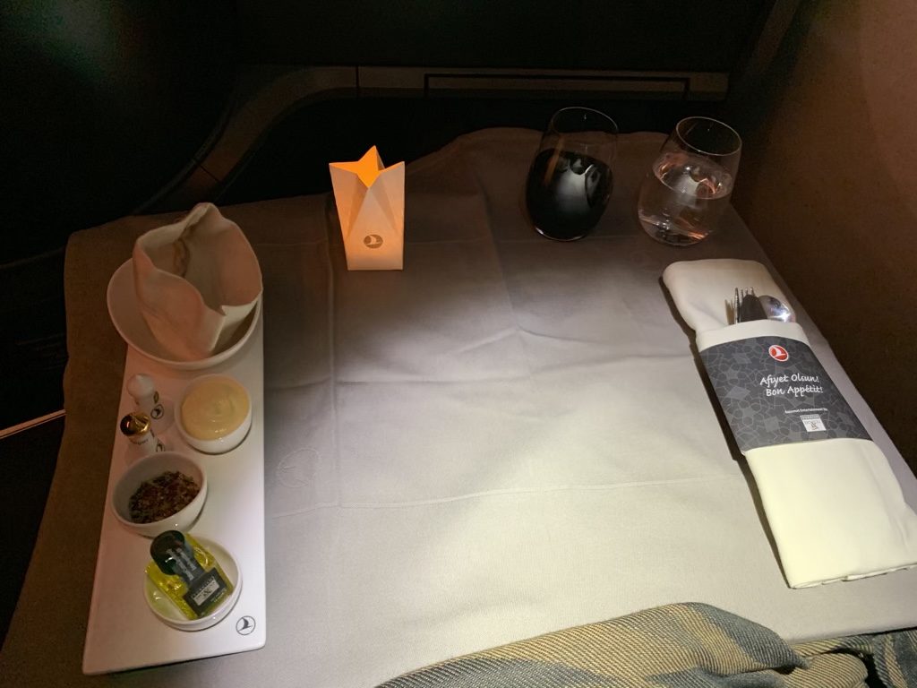Nach den Canapees wurden die Tische eingedeckt. Hier glänzte Turkish Airlines wieder, zumindest gefiel mir das Setup extrem gut und die kleine (elektro) Kerze war eine sehr nette Idee.