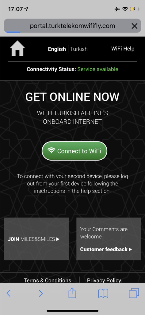 Grundsätzlich verfügte die Turkish Airlines Boeing 787-9 auch über WIFI, welches für Business Class Passagiere sogar kostenlos wäre. Allerdings konnte ich nicht über die Anmeldeseite hinaus kommen, was ein wenig frustrierend war. Wie ich später gelernt habe, funktionierte das WIFI auf den Boeing 787-9 zu diesen Zeitpunkt generell noch nicht. Ein kurzer Hiwis wäre hier sicher hilfreich gewesen.