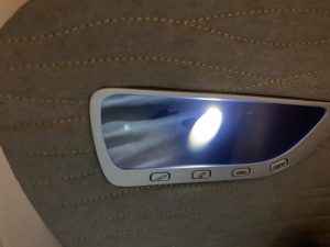 In die Sichtblende war auch die Leselampe eingelassen, welche ich schon von Singapore Airlines kannte und die mich mit ihren drei LED Leuchten irgendwie begeisterte. Hiermit konnte man tatsächlich sehr individuell seinen Sitz so ausleuchten, wie man es gerne haben wollte.