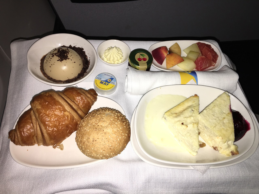 Außerdem wurde das Menü für den Flug vorgestellt. Man hatte die Wahl zwischen drei Hauptgerichten (in der Regel jeweils ein Fleisch-, Fisch-, und vegetarisches Gericht). Ich entschied mich diesmal für das vegetarische Gericht, welches aus zwei Stück Käsekuchen mit Vanillesoße und Kirschen bestand.