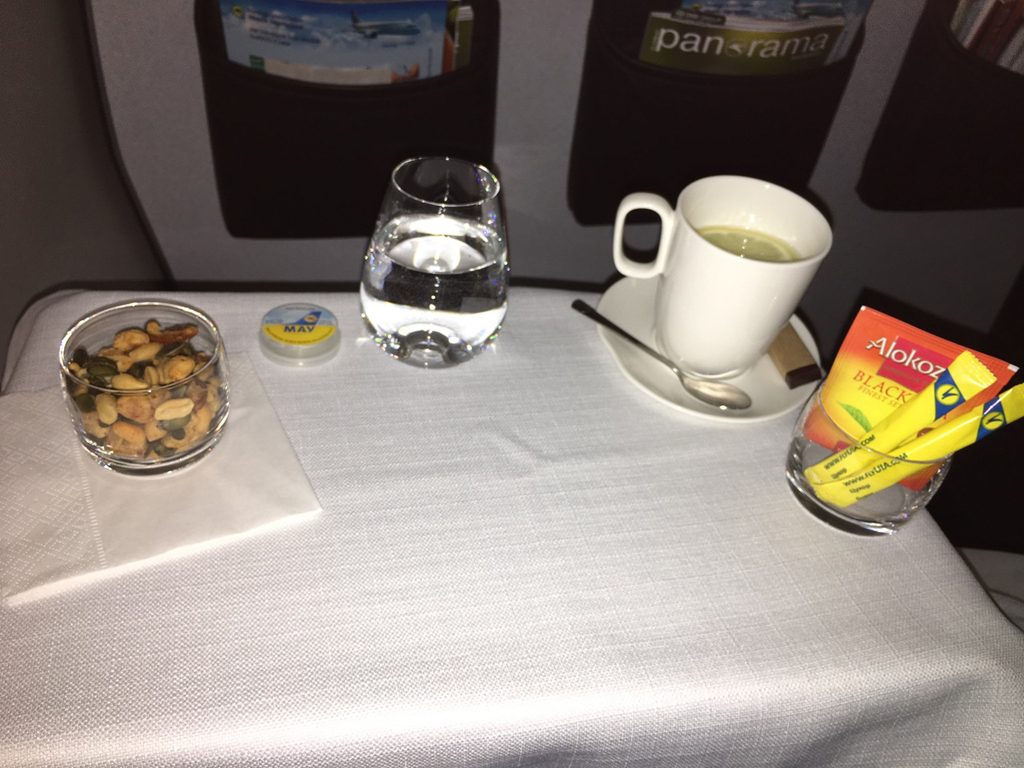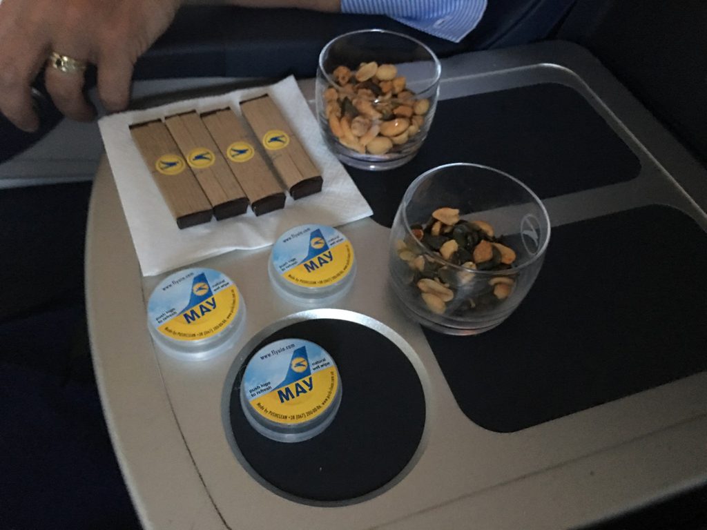 Kurz nach dem Takeoff wurden heiße Tücher gereicht und erste Getränkewünsche aufgenommen. Danach ging der Service weiter: Man bekam ein Amenity-Kit, welches aus Ohrstöpseln, einem Paar Socken und einer Augenmaske bestand. Ob dies war auf einem drei Stunden-Flug nötig ist, muss jeder selbst entscheiden. Ich persönlich schätze diese kleine Aufmerksamkeit sehr.