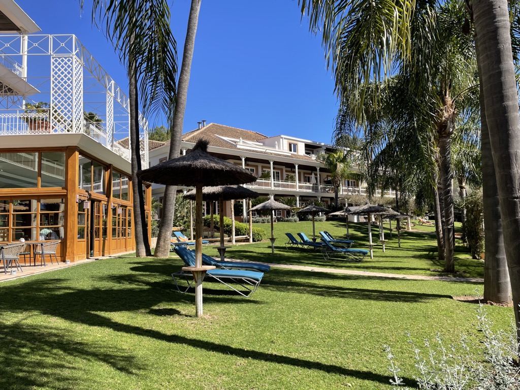 Unsere Mallorca Suite befand sich im Nebenhaus im ersten Obergeschoss und bot von der großzügigen Terrasse aus einen schönen Blick auf den Pool und das Wasserloch des Golfplatzes.