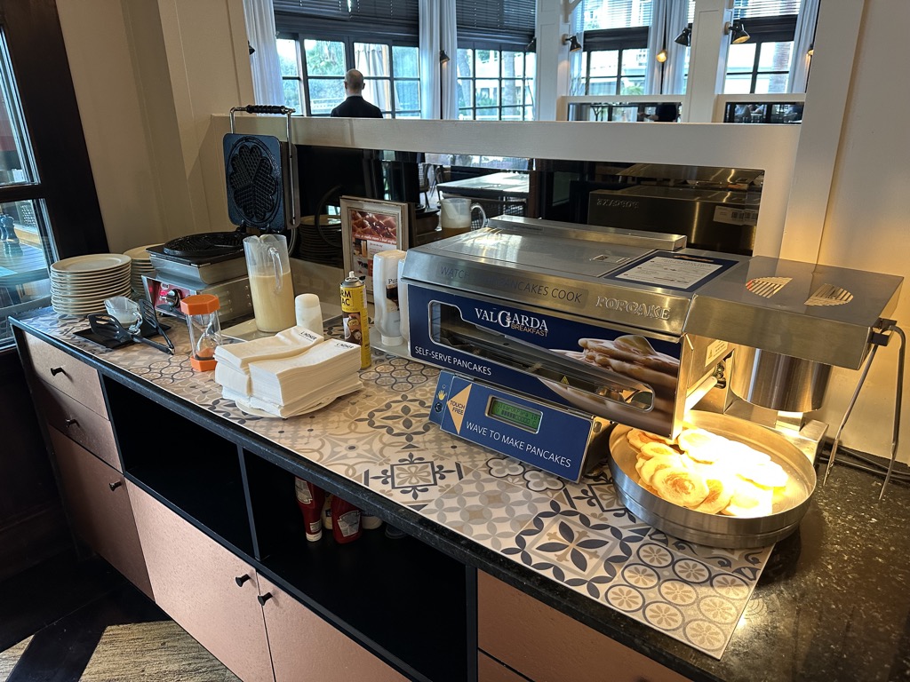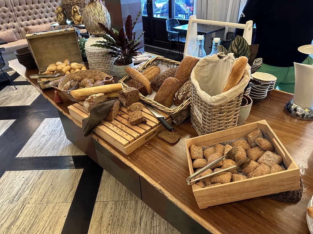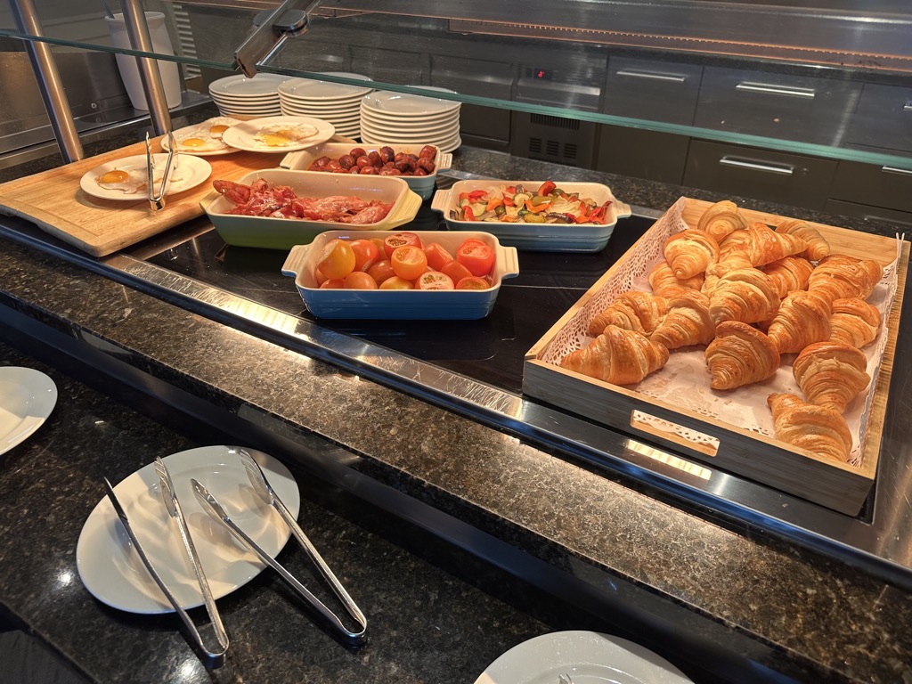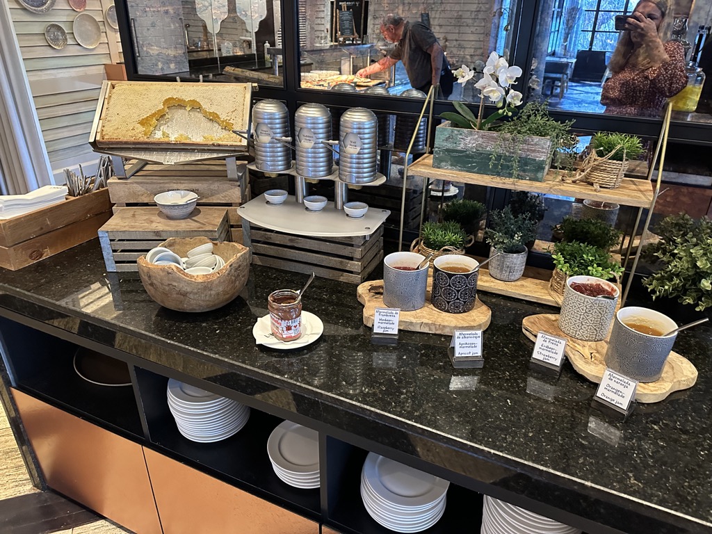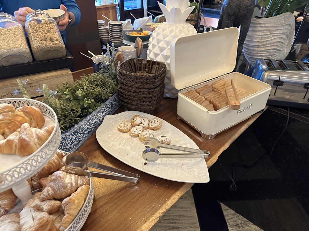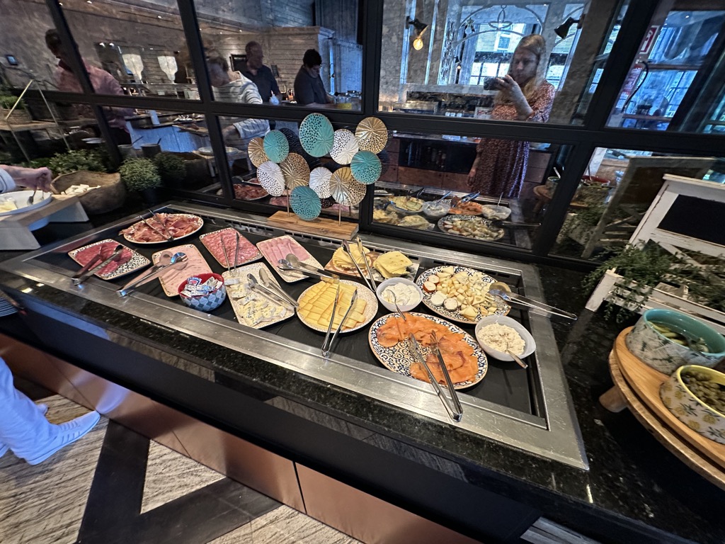 Das Frühstück im Hotel bot einiges. Es gab eine Auswahl Backwaren (auch Körnerbrot war vorhanden), verschiedene Cerealien, frisches Obst, verschiedene Joghurts, Milch in verschiedenen Ausführungen, gekühlter Sekt, Kaffeespezialitäten, Käse- und Wurstaufschnitt, Gemüse als Rohkost, Marmeladen und andere süße Aufstriche wie Nutella, ein Waffeleisen, eine Pancakemaschine, verschiedene Säfte und Wasser.