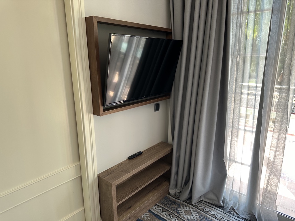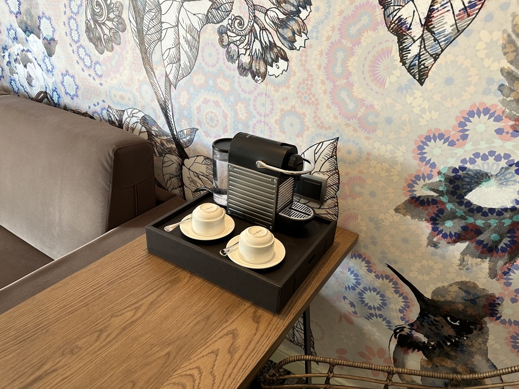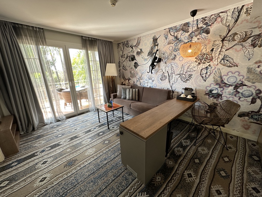 Direkt hinter der Eingangstür befindet man sich im hellen Wohnbereich, der mit einer Couch mit gegenüberliegendem Fernseher, einem lagen Schreibtisch und einem Sideboard ausgestattet war. Hier war auch die Minibar verbaut, die bei der Mallorca Suite im Zimmerpreis enthalten ist und täglich mit Softdrinks, Wein, Spirituosen, Chips, Gummibärchen und Schokolade aufgefüllt wird. Auf dem Schreibtisch konnte man natürlich auch noch eine Kaffeemaschine finden, die von Christoph täglich benutzt wurde.
