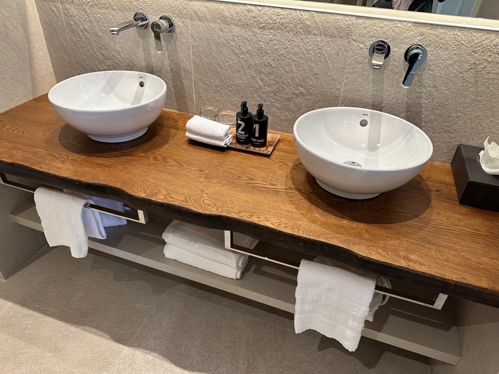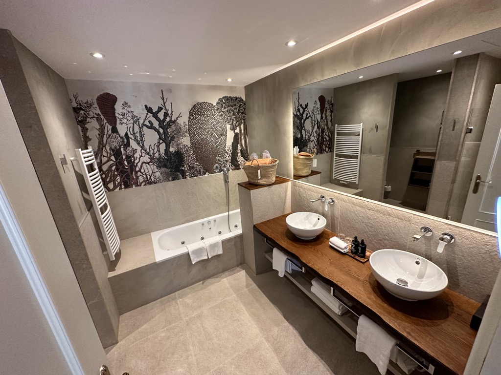 Das angrenzende große Badezimmer bot neben einem Doppelwaschtisch mit viel Ablagefläche auch noch eine Whirlpoolbadewanne, eine Dusche mit Regenduschkopf und ein WC. Im Bad waren Shampoo, Conditioner, Duschgel und Lotion in Spendern vorhanden, sogar für die Kinder gab es Kosmetik und Kapuzenhandtücher.