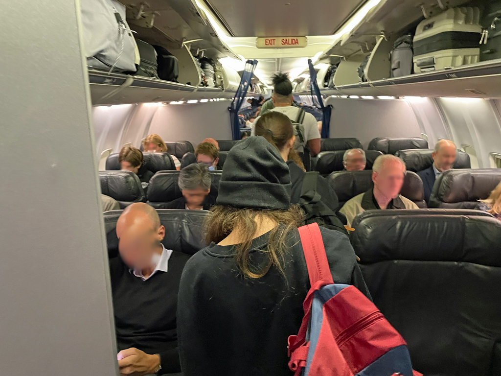 In der Boeing 737-800, mit der ich unterwegs war, hatte insgesamt 166 Sitze. Davon 16 Sitze in der Domestic First Class in 2-2 Konfiguration. Der Sitzabstand beträgt dort 93cm bei 51cm Sitzbreite. Die 48 Sitze in Economy Plus (E+) bieten Passagieren ca. 88cm Sitzabstand (an den Notausgängen sogar noch mehr) und 44,5cm Sitzbreite. In der normalen Economy Class (Coach) gibt es dann nur noch 76cm Sitzabstand, wobei die Sitzbreite ebenfalls 44,5cm beträgt. In beiden Economysektionen ist die Konfiguration 3-3.