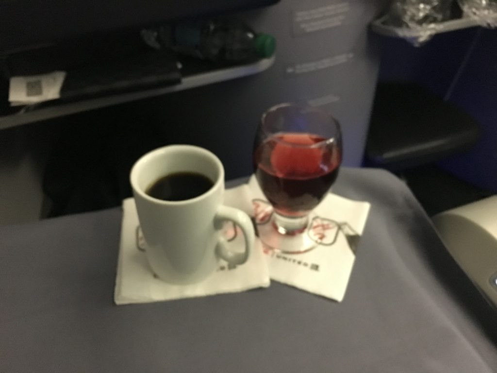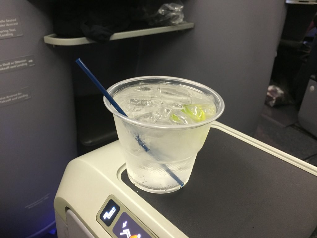 Ein Nachteil der United Airlines Boeing 767-300er ist leider, dass man immer über die vordere Tür boardet, sodass alle Passagiere durch die Business Class durchlaufen müssen. Trotz der vielen Passagieren in den Gängen wurde ich kurz nachdem ich mich gesetzt hatte, nach meinem Getränkewunsch gefragt. Mein bestellter Gin&Tonic wurde auch noch während des Boardings von der Flugbegleiterin geliefert, wobei sie sich sichtlich zu mir nach hinten kämpfen musste. Wie bei United Airlines üblich gibt es am Boden nur Plastikbecher.