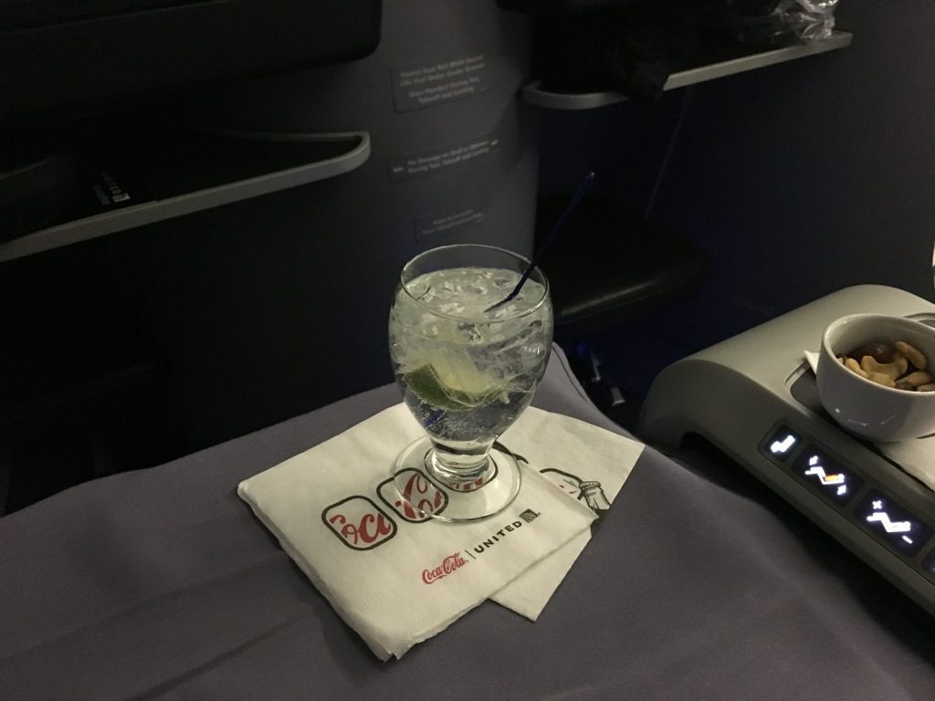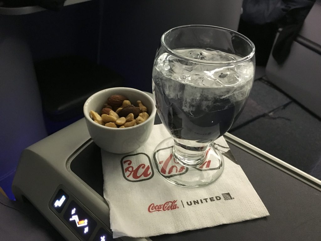 Zu Beginn werden, wie bei United Airlines üblich, warme Nüsse verteilt. Diese wurden allerdings an alle Passagiere mit Eiswasser serviert, bevor die eigentlichen Aperitifwünsche abgefragt wurden. Mein anschließend bestellter Gin&Tonic wurde allerdings sehr schnell gebracht.