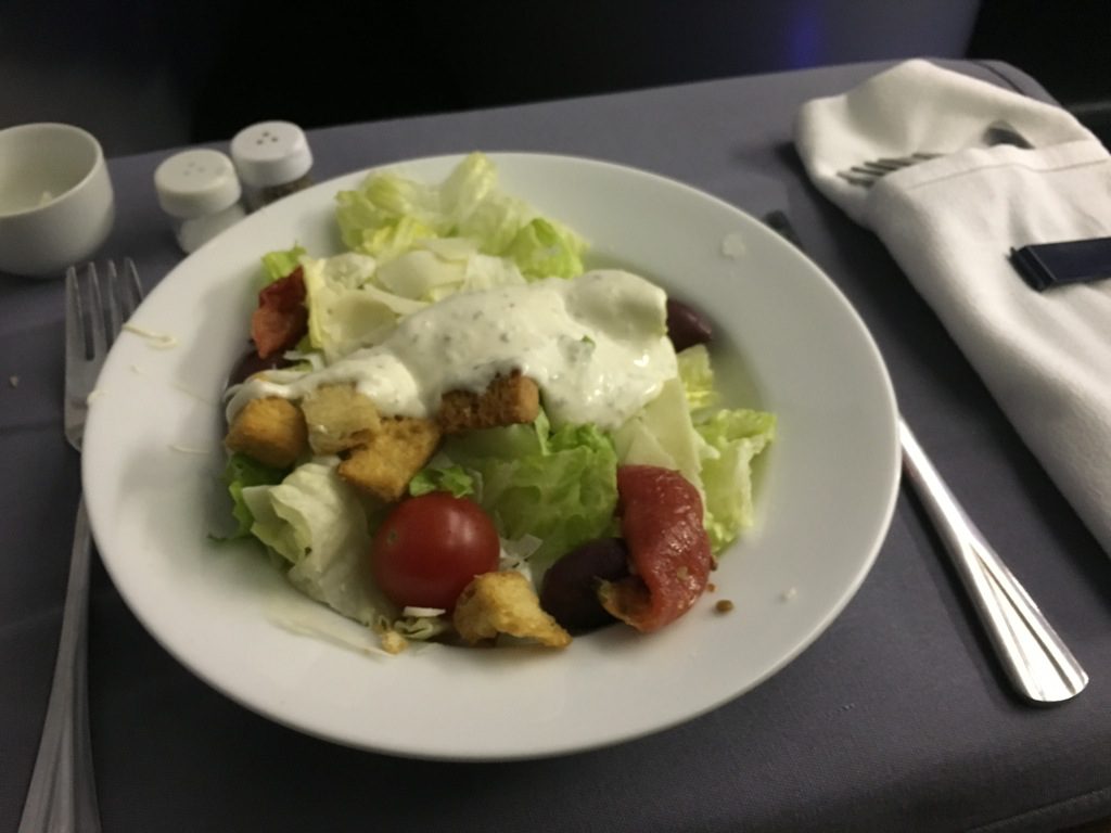 Der anschließende Salat Service wird bei den „ehemaligen Continental Crews“ immer von einem Servierwagen herunter als eigener Gang serviert. Hierbei fragt der Flugbegleiter nach dem Soßenwunsch. Die „ehemaligen United Crews“ servieren den Salat übrigens immer zusammen mit der Vorspeise auf einem Tablett.
