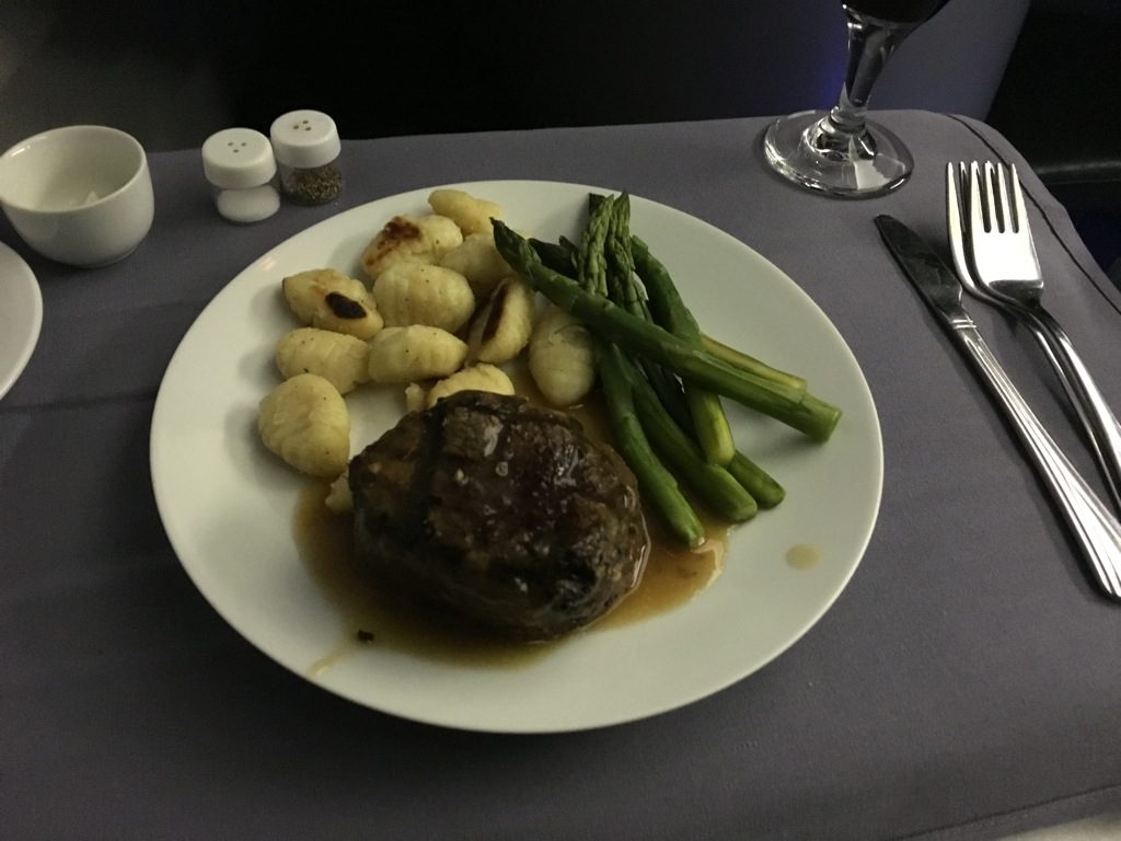 Als Hauptgang habe ich mich für das Rinderfilet entschieden. Dieses war sogar, mit etwas Fantasie, noch leicht rosa in der Mitte. Für ein Business Class Steak war es wirklich gut, wenn auch natürlich nicht mit einem Steak am Boden zu vergleichen.