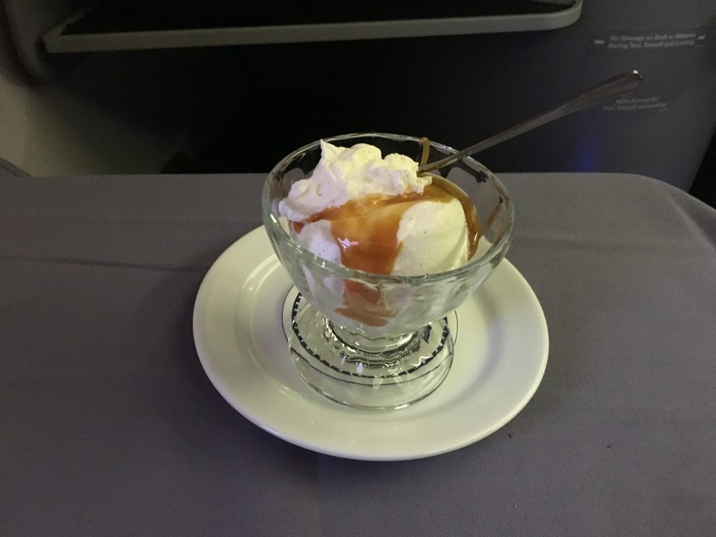 Das klassische United Airlines Dessert ist immer Eiscreme. Die Eisbecher werden vor dem Fluggast individuell mit verschiedenen Soßen und anderen Toppings vorbereitet.