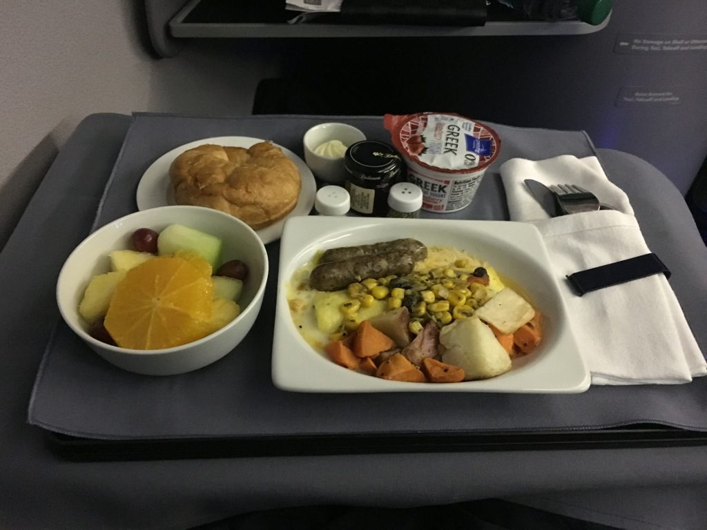 Das Frühstück wird komplett auf einem Tablett serviert. Dabei hatte ich die Wahl zwischen Omelett und Müsli. Ich habe mich für das Texas style Omelett entschieden. Die Eierspeisen waren auch vollkommen in Ordnung und insbesondere gut gewürzt, was im Flugezug immer eine gute Sache ist.