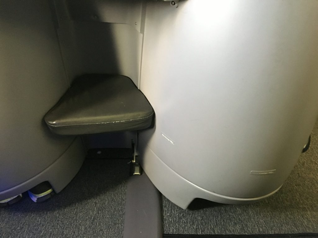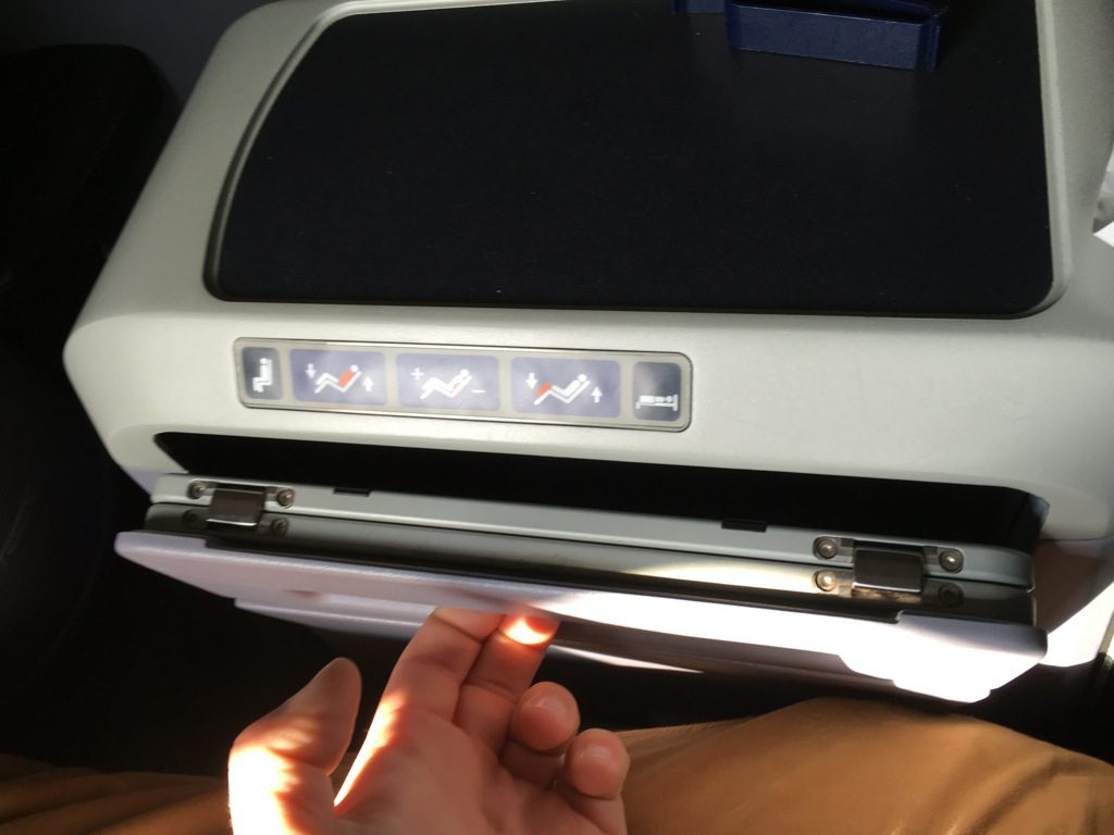 Der Sitz ist, wie man es von einer modernen Business Class erwartet, full flat, lässt sich also 180° flach stellen. Wie meistens in der Business Class erreicht man dies durch eine etwas ineinander verschachtelte Anordnung der Sitze. Die führt bei der United Airlines Business Class zu einem Recht kleinen Fußfach, welches am Vordersitz angebracht ist.