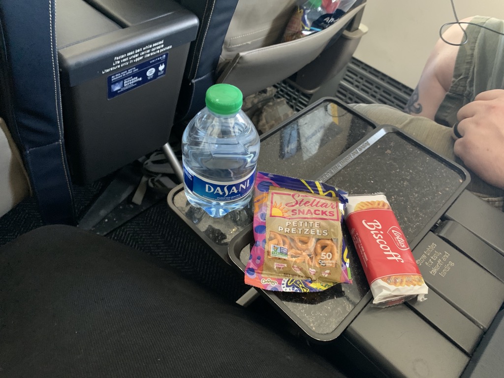 Die Flugzeit von Phoenix nach Denver beträgt etwa 90 Minuten und auf dieser Flugzeit gab es auch vor Corona kein wirkliches Catering. Lediglich ein Snack Korb wurde gereicht, welcher aktuell gestrichen ist. Alle Passagiere erhalten aber eine All in one Snack Bag, in welcher ein Wasser sowie Brezeln und Kekse sind. Weitere Snacks gibt es erst ab drei Stunden Flugzeit in der First Class.