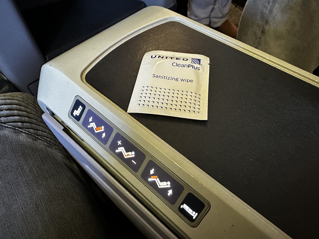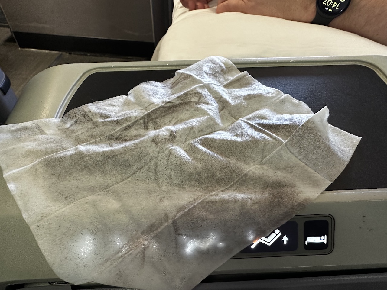Die Ablageflächen sind begrenzt, wer alleine fliegt, kann sich nicht wirklich vom Nachbar oder der Nachbarin abschotten. Das Desinfektionstuch habe ich mal für den Cocktailtisch missbraucht. Naja, gar nicht weiter darüber nachdenken…