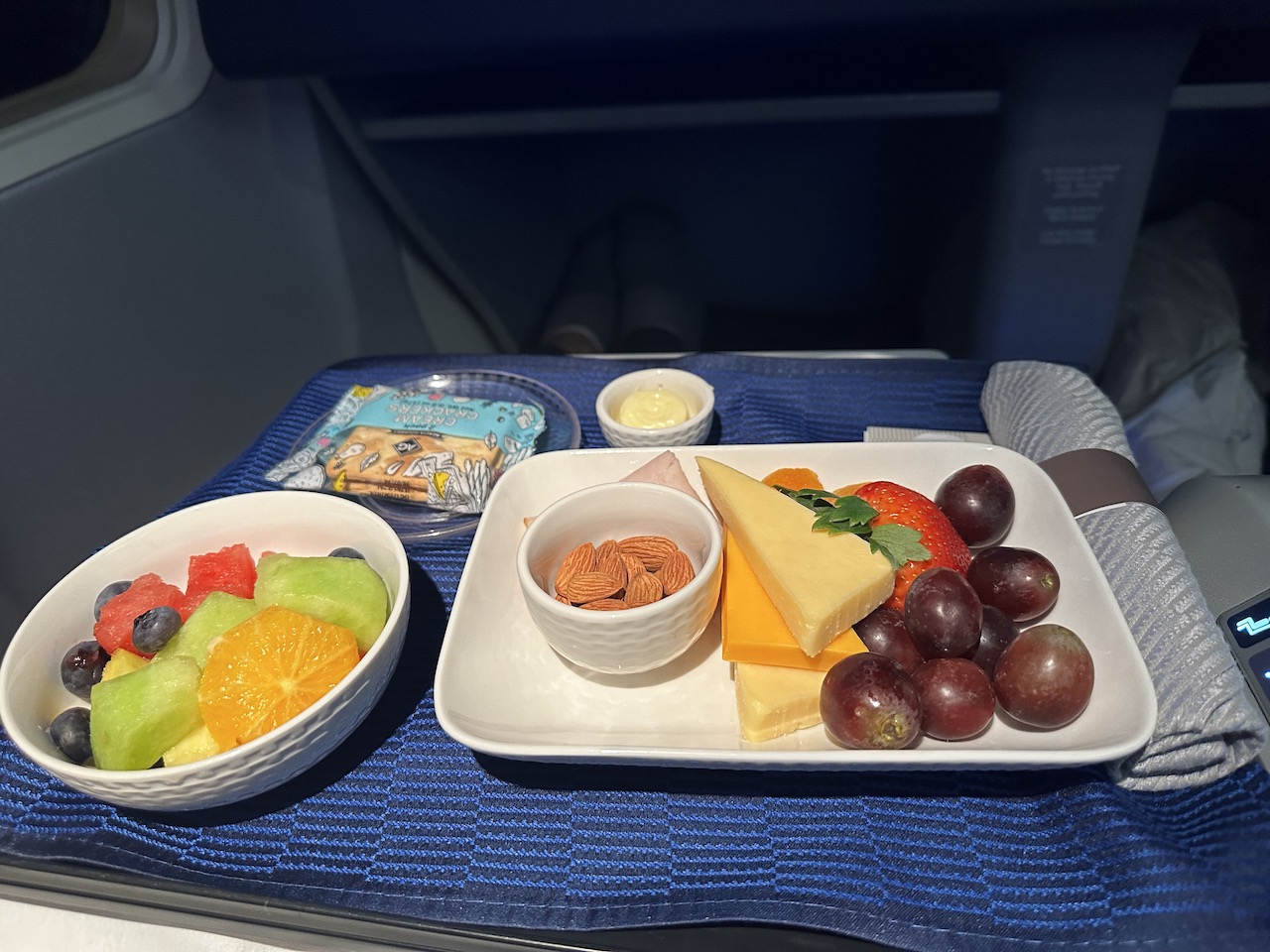 Nach einem Film und etwas Schlaf wurde eine kleine Käseplatte mit Früchten serviert. Die Flugbegleiterin drehte noch eine Runde und verabschiedete sich, die Landung erfolgte überpünktlich.