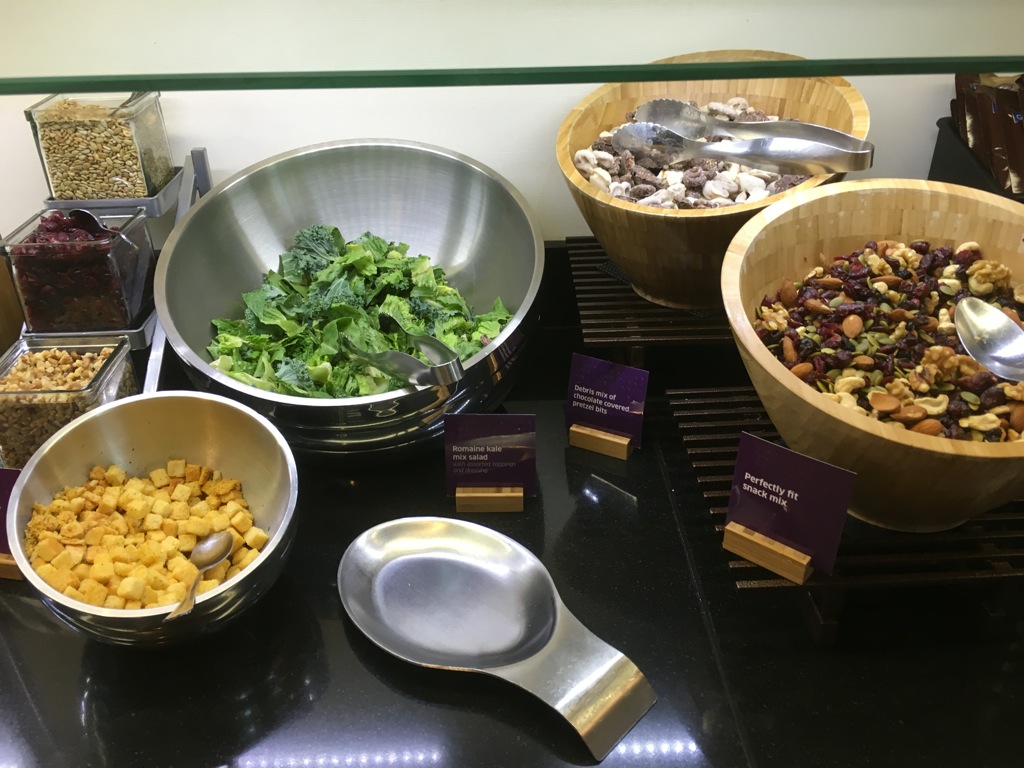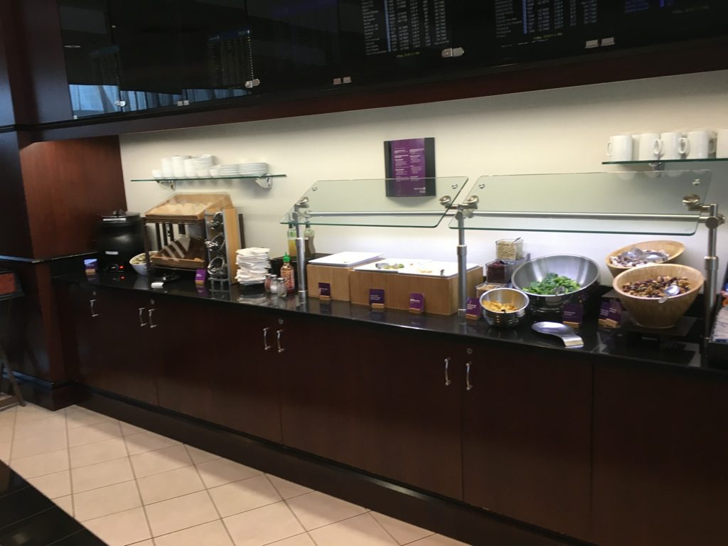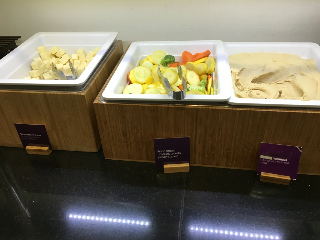 Auf dem Buffet wurde eine kleine Auswahl an Snacks angeboten. Neben Nüssen und Crakern gab es auch Salat, Gemüse, Humus und Käsewürfel. Auch eine Suppe stand als warme Option auf dem Buffet. Wer vor seinem Abflug noch wirklich etwas essen will, sollte dies in einen der vielen Restaurants im Terminal machen.
