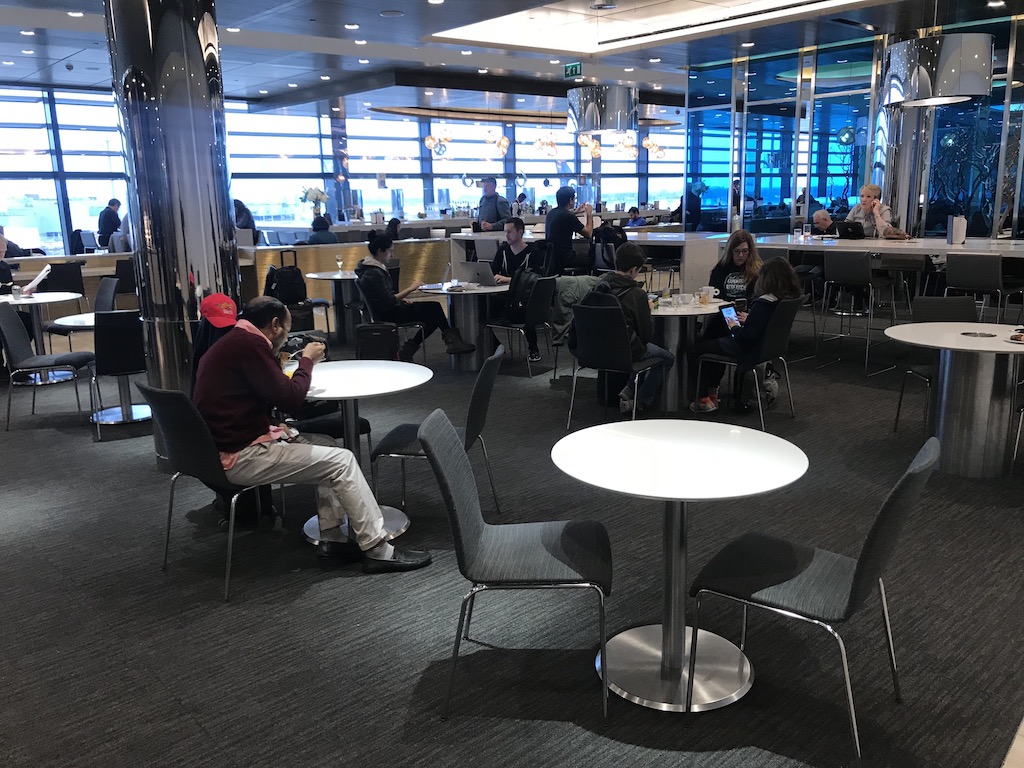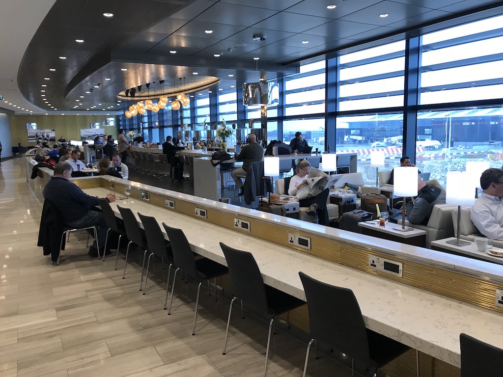 Die Lounge ist allgemein sehr modern und offen gestaltet und bietet viele verschiedene Sitzmöglichkeiten. Unter anderem gibt es verschiedene Bereiche mit Tischen zum Essen und/oder Arbeiten. Dabei sind viele Sitzplätze an der großen Fensterfront in Richtung des sich derzeit im Umbau befindlichen Vorfeldes vor Terminal 2 angelegt. Dadurch wirkt die Lounge sehr gut natürlich ausgeleuchtet und bietet zudem auch Aviation-Geeks einen interessanten Ausblick auf das rege Flugtreiben der vielen verschiedenen Airlines an einem der größten Airports Europas.